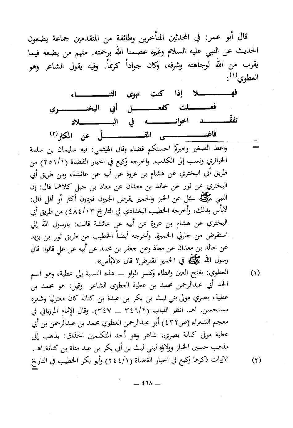 (¬1) العطوى: بفتح العين والطاء وكسر الواو - هذه النسبة إلى عطية، وهو اسم الجد أبى عبد الرحمن محمد بن عطية العطوى الشاعر وقيل: هو محمد بن عطية، بصرى مولى بنى ليث بن بكر بن عبدة بن كنانة كان معتزليا وشعره مستحسن. اهـ. انظر اللباب (2/ 346 - 347). وقال الإِمام المرزبانى في معجم الشعراء (ص 432) أبو عبد الرحمن العطوى محمد بن عبد الرحمن بن أبى عطية مولى كنانة بصرى، شاعر وهو أحد المتكلمين الحذاق: يذهب إلى مذهب حسين الخباز وولاؤه لبنى ليث بن أبى بكر بن عبد مناة بن كنانة. اهـ.