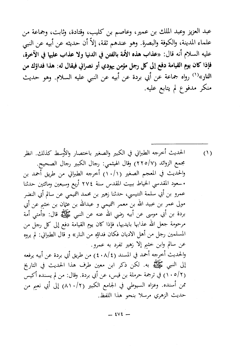 والحديث في المعجم الصغير (1/ 10) أخرجه الطبرانى من طريق أحمد بن مسعود المقدسى الخياط ببيت المقدس سنة 274 أربع وسبعين ومائتين حدثنا عمرو بن أبى سلمة التنيسى، حدثنا زهير بن محمد التميمى عن سالم أبى النضر مولى عمر بن عبيد اللَّه بن معمر التميمى وعبد اللَّه بن عثمان بن خثيم عن أبى بردة بن أبى موسى عن أبيه رضى اللَّه عنه عن النبى -صلى اللَّه عليه وسلم- قال: "أمتى أمة مرحومة جعل اللَّه عذابها بايديها، فإذا كان يوم القيامة دفع إلى كل رجل من المسلمين رجل من أهل الأديان فكان فداؤه من النار" وقال الطبرانى: لم يروه عن سالم وابن خثيم إلا زهير تفرد به عمرو.