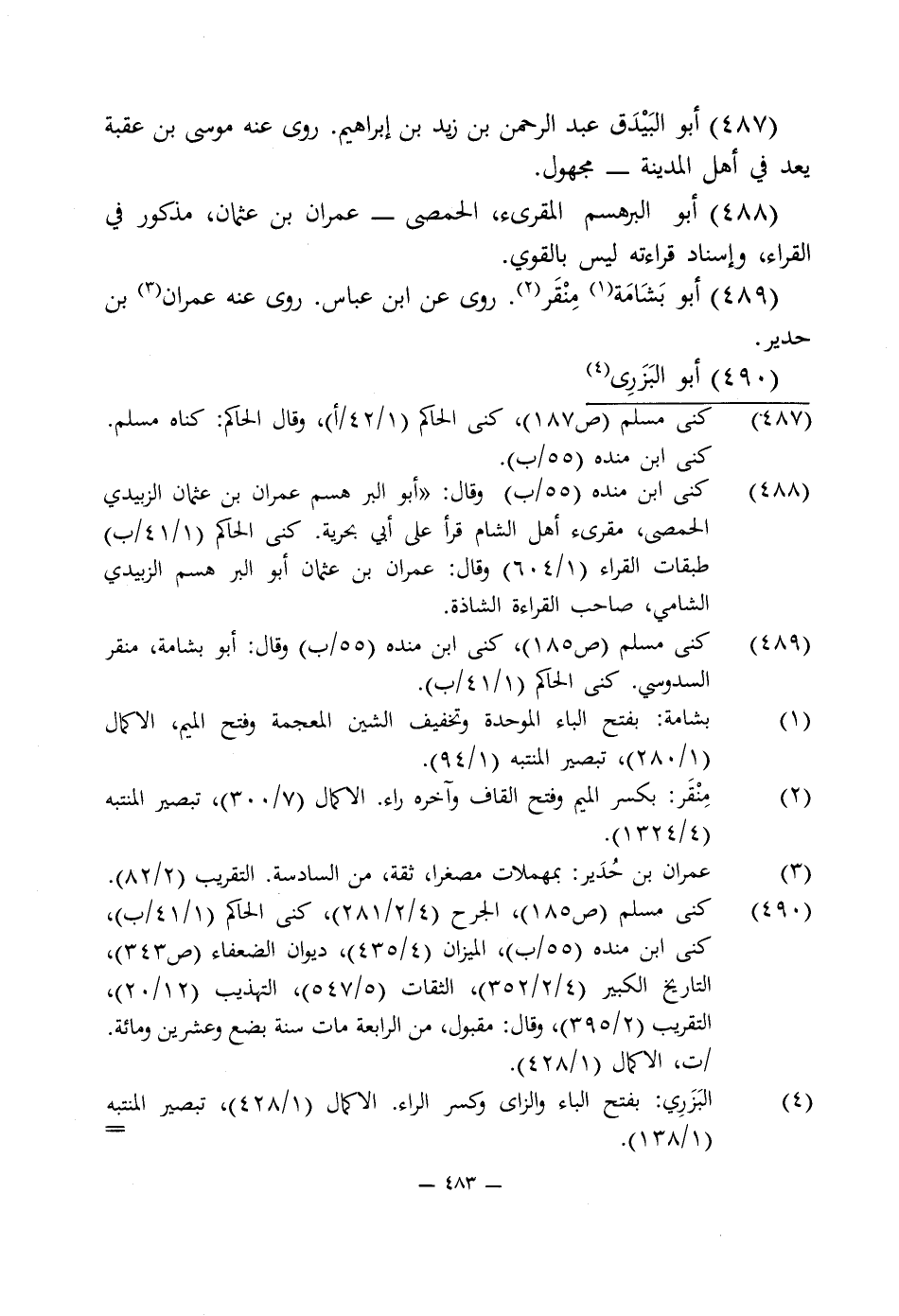 488 - كنى ابن منده (55/ ب) وقال: "أبو البر هسم عمران بن عثمان الزبيدى الحمصى، مقرئ أهل الشام قرأ على أبى بحرية. كنى الحاكم (1/ 41/ ب) طبقات القراء (1/ 604) وقال: عمران بن عثمان أبو البر هسم الزبيدى الشامى، صاحب القراءة الشاذة.