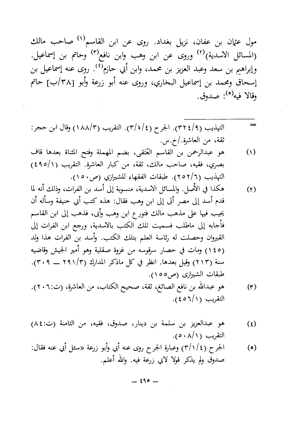 مول عثمان بن عفان، نزيل بغداد. روى عن ابن القاسم (¬1) صاحب مالك (المسائل الاسدية) (¬2) وروى عن ابن وهب وابن نافع (¬3) وحاتم بن إسماعيل. وإبراهيم بن سعد وعبد العزيز بن محمد، وابن أبى حازم (¬4). روى عنه إسماعيل بن إسحاق ومحمد بن إسماعيل البخارى، وروى عنه أبو زرعة وأبو حاتم وقالا فيه (¬5): صدوق.