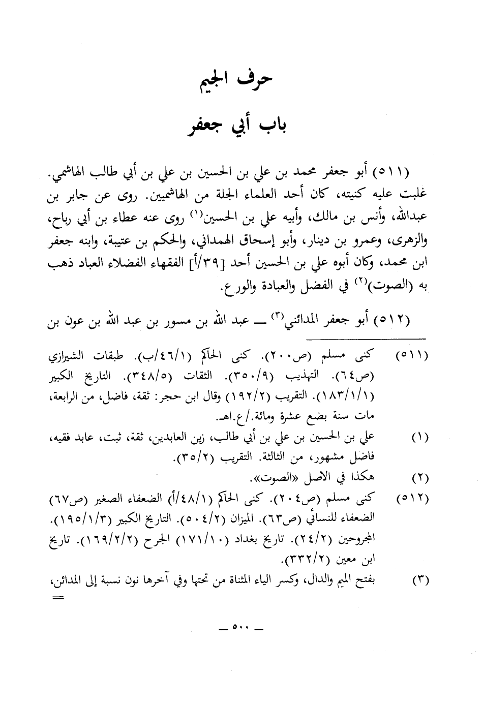 511 - كنى مسلم (ص 200). كنى الحاكم (1/ 46/ ب). طبقات الشيرازى (ص 64). التهذيب (9/ 350). الثقات (5/ 348). التاريخ الكبير (1/ 1/ 183). التقريب (2/ 192) وقال ابن حجر: ثقة، فاضل، من الرابعة، مات سنة بضع عشرة ومائة. /ع. اهـ.