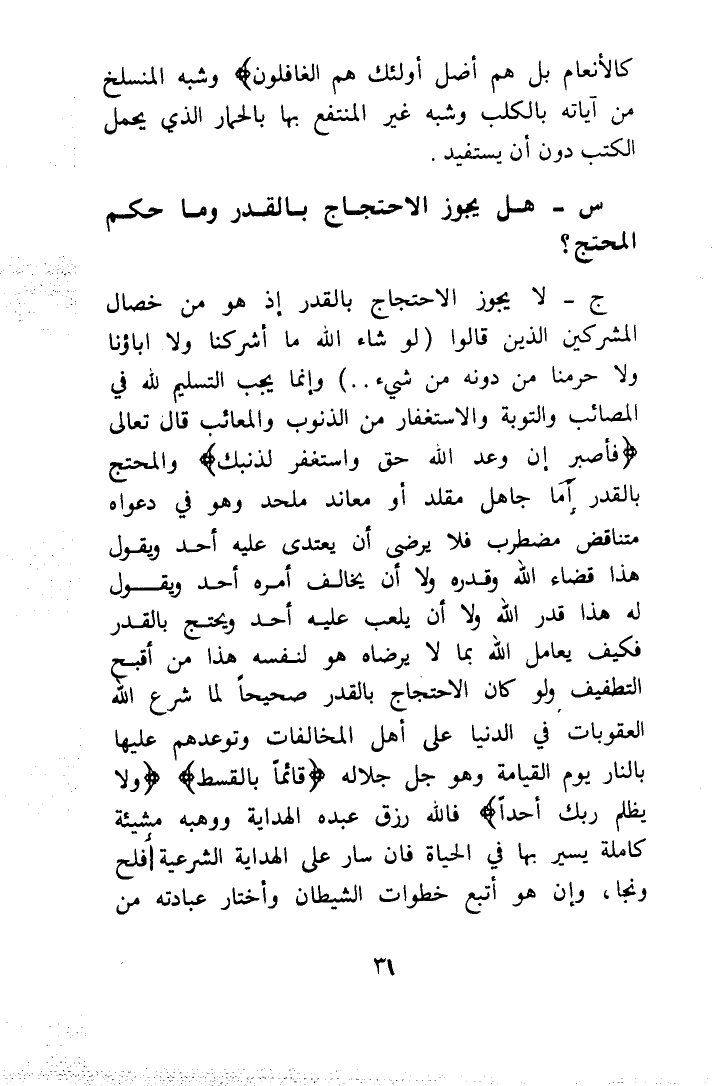 ج) لا يجوز الاحتجاج بالقدر، إذ هو من خصال المشركين الذين قالوا {لَوْ شَاءَ اللَّهُ مَا عَبَدْنَا مِنْ دُونِهِ مِنْ شَيْءٍ..} .