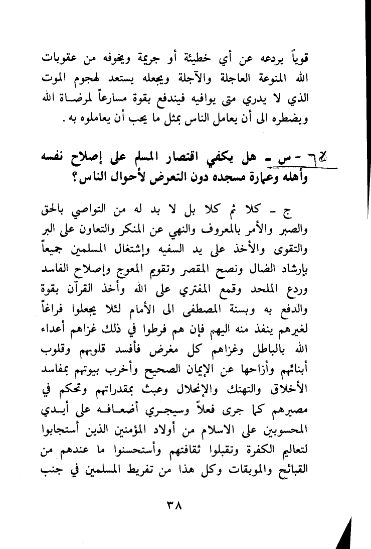 س) هل يكفي اقتصار المسلم على إصلاح نفسه وأهله وعمارة مسجده دون التعرض لأحوال الناس؟