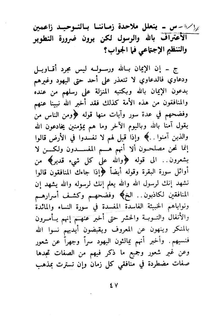 س) يتعلل ملاحدة زماننا بالتوحيد زاعمين الاعتراف بالله والرسول لكن يرون ضرورة التطوير والتنظيم الاجتماعي فما الجواب؟