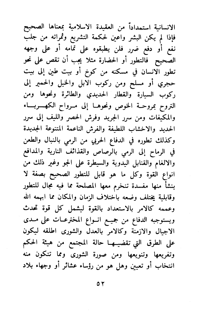 فالتطور أو الحضارة مثلا يجب أن تقصر على نحو تطور الإنسان في مسكنه من كوخ أو بيت طين إلى بيت حجري أو مسلح، ومن ركوب الإبل والخيل والحمير إلى ركوب السيارة والقطار الحديدي والطائرة ونحوها، ومن التروح بمروحة الخوص ونحوها إلى مراوح الكهرباء والمكيفات، ومن سرر الجريد وفرش الحصر والليف إلى سرر الحديد والأخشاب اللطيفة والفرش الناعمة المتنوعة الجديدة، وكذلك تطوره في الدفاع الحربي من الرمي بالنبال والطعن في الرماح إلى الرمي بالرصاص والقذائف النارية والمدافع والألغام والقنابل اليدوية والسيطرة على الجو وغير ذلك من أنواع القوة.