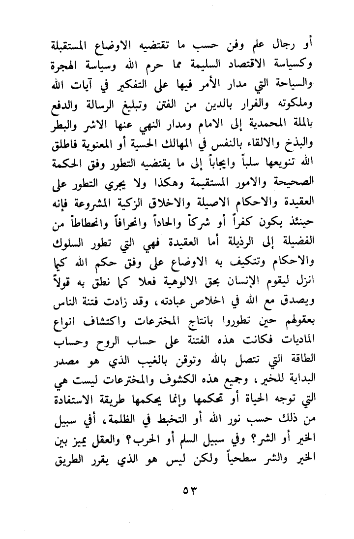 أو رجال علم وفن، حسب ما تقتضيه الأوضاع المستقبلة، وكسياسة الاقتصاد السليمة مما حرم الله، وسياسة الهجرة والسياحة التي مدار الأمر فيها على التفكير في آيات الله وملكوته والفرار بالدين من الفتن وتبليغ الرسالة والدفع بالملة المحمية إلى الأمام، ومدار النهي عنها؛ الأشر والبطر والبذخ والإلقاء بالنفس في المهالك الحسية أو المعنوية، فاطلق الله تنويعها سلباً وإيجاباً إلى ما يقتضيه التطور وفق الحكمة الصحيحة والأمور المستقيمة، وهكذا.