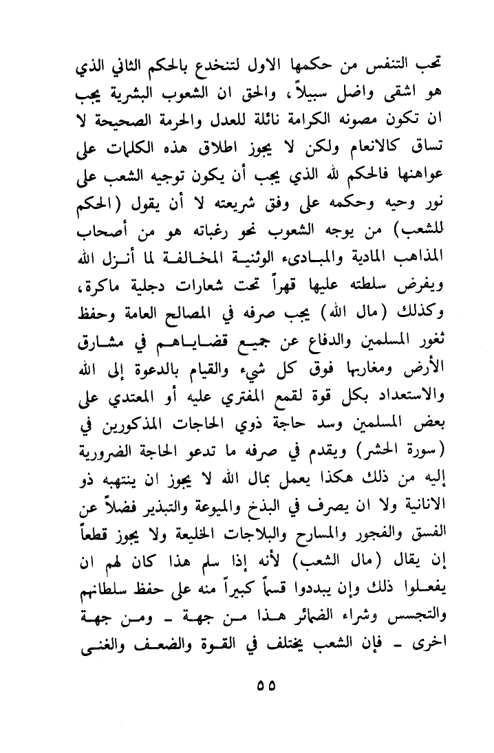ولكن لا يجوز إطلاق هذه الكلمات على عواهنها، فالحكم لله الذي يجب أن يكون توجيه الشعب على نور وحيه وحكمه على وفق شريعته، لا أن يقول (الحكم للشعب) ، من يوجه الشعوب نحو رغباته هو من أصحاب المذاهب المادية والمبادئ الوثنية المخالفة لما أنزل الله، ويفرض سلطته عليها قهراً، تحت شعارات دجلية ماكرة.