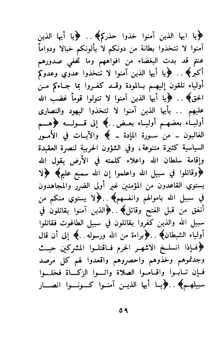 وفي الشؤون الحربية لنصرة العقيدة وإقامة سلطان الله وإعلاء كلمته في الأرض يقول الله {وَقَاتِلُوا فِي سَبِيلِ اللَّهِ وَاعْلَمُوا أَنَّ اللَّهَ سَمِيعٌ عَلِيمٌ} ، {لا يَسْتَوِي الْقَاعِدُونَ مِنَ الْمُؤْمِنِينَ غَيْرُ أُولِي الضَّرَرِ وَالْمُجَاهِدُونَ فِي سَبِيلِ اللَّهِ بِأَمْوَالِهِمْ وَأَنْفُسِهِمْ فَضَّلَ اللَّهُ الْمُجَاهِدِينَ بِأَمْوَالِهِمْ وَأَنْفُسِهِمْ} ، {لا يَسْتَوِي مِنْكُمْ مَنْ أَنْفَقَ مِنْ قَبْلِ الْفَتْحِ وَقَاتَلَ} ، {الَّذِينَ آمَنُوا يُقَاتِلُونَ فِي سَبِيلِ اللَّهِ وَالَّذِينَ كَفَرُوا يُقَاتِلُونَ فِي سَبِيلِ الطَّاغُوتِ فَقَاتِلُوا أَوْلِيَاءَ الشَّيْطَانِ} ، {بَرَاءَةٌ مِنَ اللَّهِ وَرَسُولِهِ..} إلى أن قال {فَإِذَا انْسَلَخَ الْأَشْهُرُ الْحُرُمُ فَاقْتُلُوا الْمُشْرِكِينَ حَيْثُ وَجَدْتُمُوهُمْ وَخُذُوهُمْ وَاحْصُرُوهُمْ وَاقْعُدُوا لَهُمْ كُلَّ مَرْصَدٍ فَإِنْ تَابُوا وَأَقَامُوا الصَّلاةَ وَآتَوُا الزَّكَاةَ فَخَلُّوا سَبِيلَهُمْ} ، {يَا أَيُّهَا الَّذِينَ آمَنُوا كُونُوا أَنْصَارَ