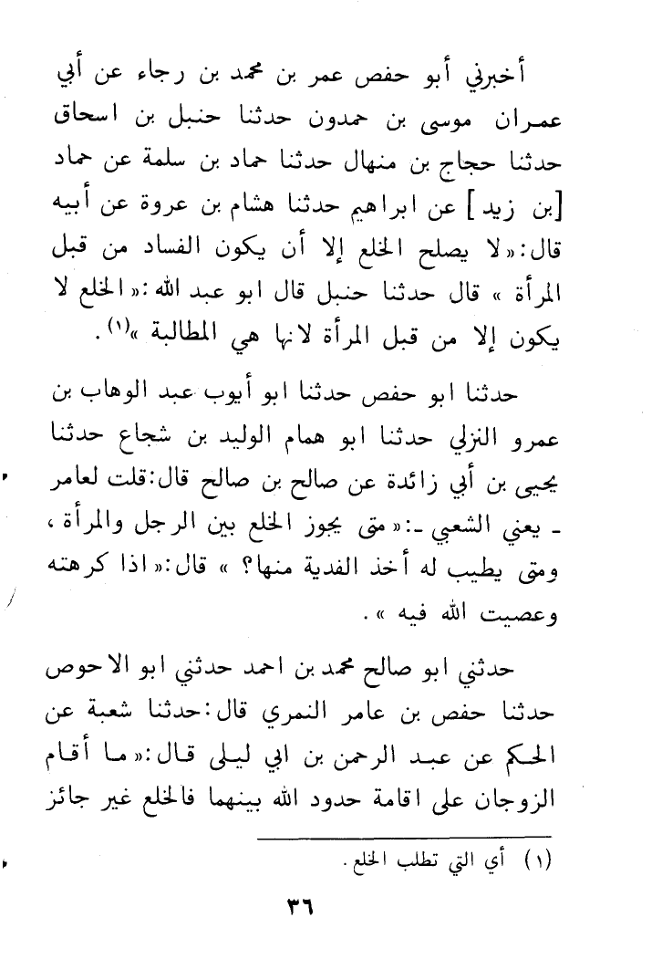 أَخْبَرَنِي أَبُو حَفْصٍ عُمَرُ بْنُ مُحَمَّدِ بْنِ رَجَاءٍ , عَنْ أَبِي عِمْرَانَ مُوسَى بْنِ حَمْدُونَ , حَدَّثَنَا حَنْبَلُ بْنُ إِسْحَاقَ , حَدَّثَنَا حَجَّاجُ بْنُ مِنْهَالٍ , حَدَّثَنَا حَمَّادُ بْنُ سَلَمَةَ , عَنْ حَمَّادٍ , عَنْ إِبْرَاهِيمَ , حَدَّثَنَا هِشَامُ بْنُ عُرْوَةَ , عَنْ أَبِيهِ , قَالَ: §«لَا يَصْلُحُ الْخُلْعُ إِلَّا أَنْ يَكُونَ الْفَسَادُ مِنْ قِبَلِ الْمَرْأَةِ»