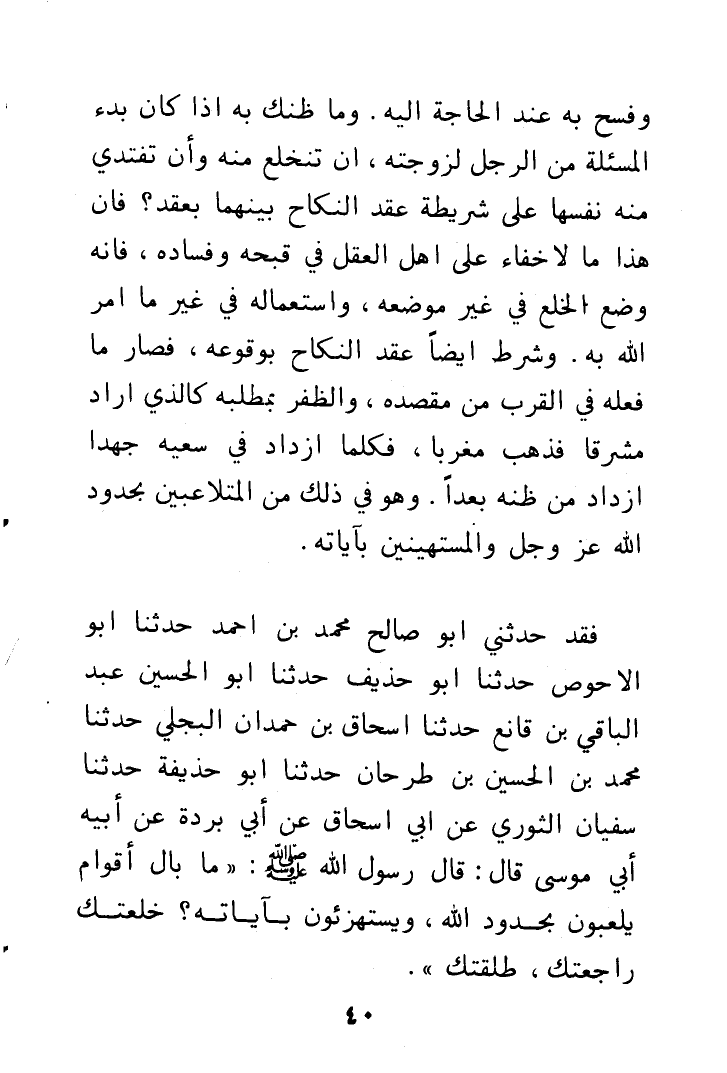 فَقَدْ: حَدَّثَنِي أَبُو صَالِحٍ مُحَمَّدُ بْنُ أَحْمَدَ , حَدَّثَنَا أَبُو الْأَحْوَصِ , حَدَّثَنَا أَبُو حُذَيْفَةَ , ح وَحَدَّثَنَا أَبُو الْحُسَيْنِ عَبْدُ الْبَاقِي بْنُ قَانِعٍ , حَدَّثَنَا إِسْحَاقُ بْنُ حَمْدَانَ الْبَجَلِيُّ , حَدَّثَنَا مُحَمَّدُ بْنُ الْحُسَيْنِ بْنِ طَرْخَانَ , حَدَّثَنَا أَبُو حُذَيْفَةَ , حَدَّثَنَا سُفْيَانُ الثَّوْرِيُّ , عَنْ أَبِي إِسْحَاقَ , عَنْ أَبِي بُرْدَةَ , عَنْ أَبِيهِ أَبِي مُوسَى , قَالَ: قَالَ رَسُولُ اللَّهِ صَلَّى اللهُ عَلَيْهِ وَسَلَّمَ: «§مَا بَالُ أَقْوَامٍ يَلْعَبُونَ بِحُدُودِ اللَّهِ وَيَسْتَهْزئُونَ بِآيَاتِهِ، خَلَعْتُكِ، رَاجَعْتُكِ، طَلَّقْتُكِ، رَاجَعْتُكِ»