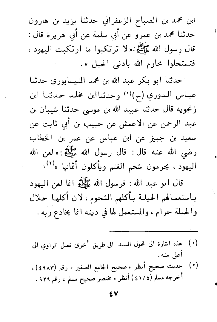 حَدَّثَنَا أَبُو بَكْرٍ عَبْدُ اللَّهِ بْنُ مُحَمَّدٍ النَّيْسَابُورِيُّ , حَدَّثَنَا الدُّورِيُّ , ح وَحَدَّثَنَا ابْنُ مَخْلَدٍ , حَدَّثَنَا ابْنُ زَنْجُوَيْهِ , قَالَ: حَدَّثَنَا عُبَيْدُ اللَّهِ بْنُ مُوسَى , حَدَّثَنَا شَيْبَانُ بْنُ عَبْدِ الرَّحْمَنِ , عَنِ الْأَعْمَشِ , عَنْ حَبِيبِ بْنِ أَبِي ثَابِتٍ , عَنْ سَعِيدِ بْنِ جُبَيْرٍ , عَنِ ابْنِ عَبَّاسٍ , عَنْ عُمَرَ بْنِ الْخَطَّابِ رَضِيَ اللَّهُ عَنْهُ قَالَ: قَالَ رَسُولُ اللَّهِ صَلَّى اللهُ عَلَيْهِ وَسَلَّمَ: §«لَعَنَ اللَّهُ الْيَهُودَ , يُحَرِّمُونَ شَحْمَ الْغَنَمِ وَيَأْكُلُونَ أَثْمَانَهَا» قَالَ أَبُو عَبْدِ اللَّهِ: " فَرَسُولُ اللَّهِ صَلَّى اللهُ عَلَيْهِ وَسَلَّمَ إِنَّمَا لَعَنَ الْيَهُودَ بِاسْتِعْمَالِهِمُ الْحِيلَةَ بِأَكْلِهِمُ الشُّحُومَ , لِأَنَّ أَكْلَهَا حَلَالٌ , وَالْحِيلَةُ حَرَامٌ وَالْمُسْتَعْمِلُ لَهَا فِي دِينِهِ إِنَّمَا يُخَادِعُ رَبَّهُ