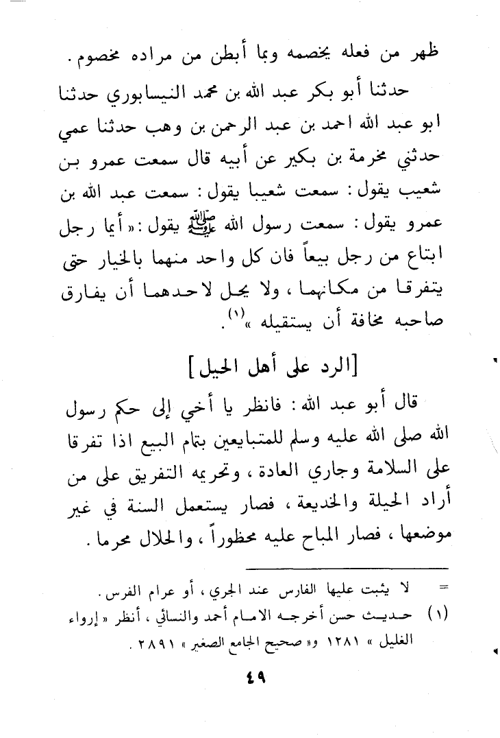 حَدَّثَنَا أَبُو بَكْرٍ عَبْدُ اللَّهِ بْنُ مُحَمَّدٍ النَّيْسَابُورِيُّ , حَدَّثَنَا أَبُو عَبْدِ اللَّهِ أَحْمَدُ بْنُ عَبْدِ الرَّحْمَنِ بْنِ وَهْبٍ , حَدَّثَنَا عَمِّي , حَدَّثَنِي مَخْرَمَةُ بْنُ بُكَيْرٍ , عَنْ أَبِيهِ , قَالَ: سَمِعْتُ عَمْرَو بْنَ شُعَيْبٍ , يَقُولُ: سَمِعْتُ شُعَيْبًا , يَقُولُ: سَمِعْتُ عَبْدَ اللَّهِ بْنَ عَمْرٍو , يَقُولُ: سَمِعْتُ رَسُولَ اللَّهِ صَلَّى اللهُ عَلَيْهِ وَسَلَّمَ يَقُولُ: §«أَيُّمَا رَجُلٍ ابْتَاعَ مِنْ رَجُلٍ بَيْعًا , فَإِنَّ كُلَّ وَاحِدٍ مِنْهُمَا بِالْخِيَارِ حَتَّى يَتَفَرَّقَا مِنْ مَكَانِهِمَا , وَلَا يَحِلُّ لِأَحَدِهِمَا أَنْ يُفَارِقَ صَاحِبَهُ مَخَافَةَ أَنْ يَسْتَقِيلَهُ» . قَالَ أَبُو عَبْدِ اللَّهِ: " فَانْظُرْ يَا أَخِي إِلَى حُكْمِ رَسُولِ اللَّهِ صَلَّى اللهُ عَلَيْهِ وَسَلَّمَ لِلْمُتَبَايِعَيْنِ بِتَمَامِ الْبَيْعِ إِذَا تَفَرَّقَا عَلَى السَّلَامَةِ وَجَارِي الْعَادَةَ , وَتَحْرِيمِهِ التَّفْرِيقَ عَلَى مَنْ أَرَادَ الْحِيلَةَ وَالْخَدِيعَةَ , فَصَارَ يَسْتَعْمِلُ السُّنَّةَ فِي غَيْرِ مَوْضِعَهَا , فَصَارَ الْمُبَاحُ عَلَيْهِ مَحْظُورًا , وَالْحَلَالُ مُحَرَّمًا.
