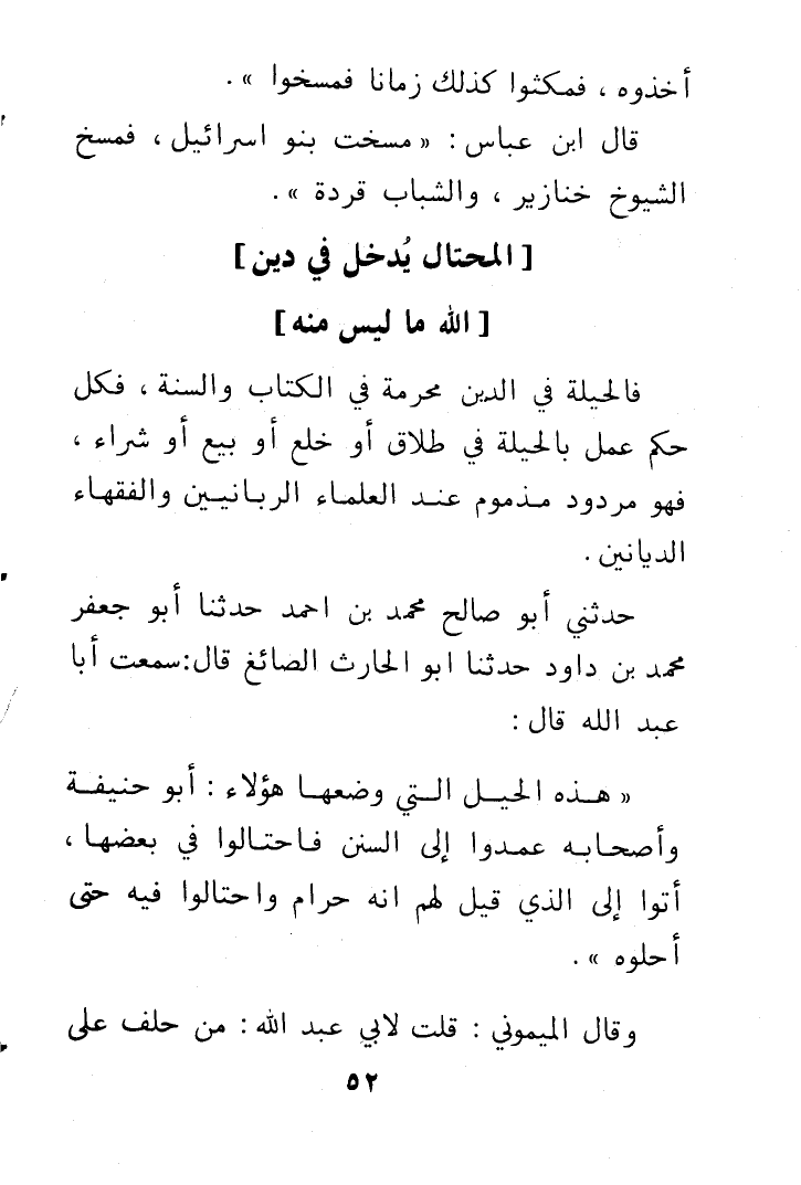 حَدَّثَنِي أَبُو صَالِحٍ مُحَمَّدُ بْنُ أَحْمَدَ , حَدَّثَنَا أَبُو جَعْفَرٍ مُحَمَّدُ بْنُ دَاوُدَ , حَدَّثَنَا أَبُو الْحَارِثِ الصَّائِغُ , قَالَ: سَمِعْتُ أَبَا عَبْدِ اللَّهِ , قَالَ: §«هَذِهِ الْحِيَلُ الَّتِي وَضَعَهَا هَؤُلَاءِ - أَبُو حَنِيفَةَ وَأَصْحَابُهُ - عَمَدُوا إِلَى السُّنَنِ فَاحْتَالُوا فِي نَقْضِهَا , أَتَوْا إِلَى الَّذِي قِيلَ لَهُمْ إِنَّهُ حَرَامٌ وَاحْتَالُوا فِيهِ حَتَّى أَحَلُّوهُ»