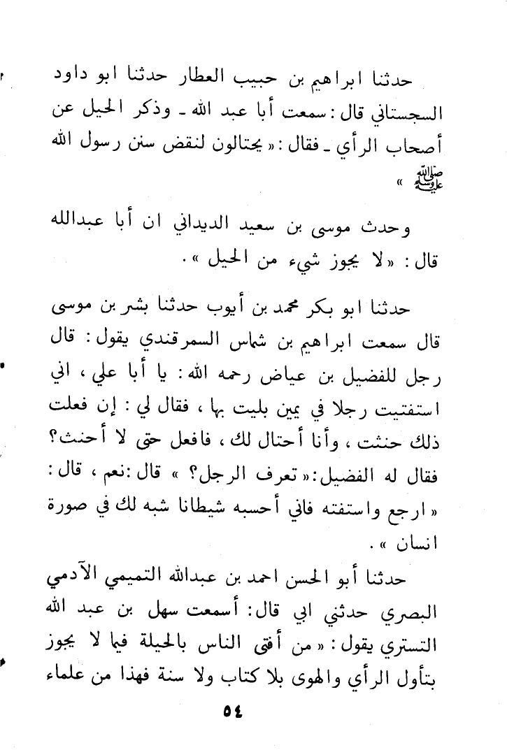 حَدَّثَنَا أَبُو الْحَسَنِ أَحْمَدُ بْنُ إِبْرَاهِيمَ بْنِ حَبِيبٍ الْعَطَّارُ , حَدَّثَنَا أَبُو دَاوُدَ السِّجِسْتَانِيُّ , قَالَ: سَمِعْتُ أَبَا عَبْدِ اللَّهِ - وَذَكَرَ الْحِيَلَ عَنْ أَصْحَابِ الرَّأْيِ , فَقَالَ: §«يَحْتَالُونَ لِنَقْضِ سُنَنِ رَسُولِ اللَّهِ صَلَّى اللهُ عَلَيْهِ وَسَلَّمَ»