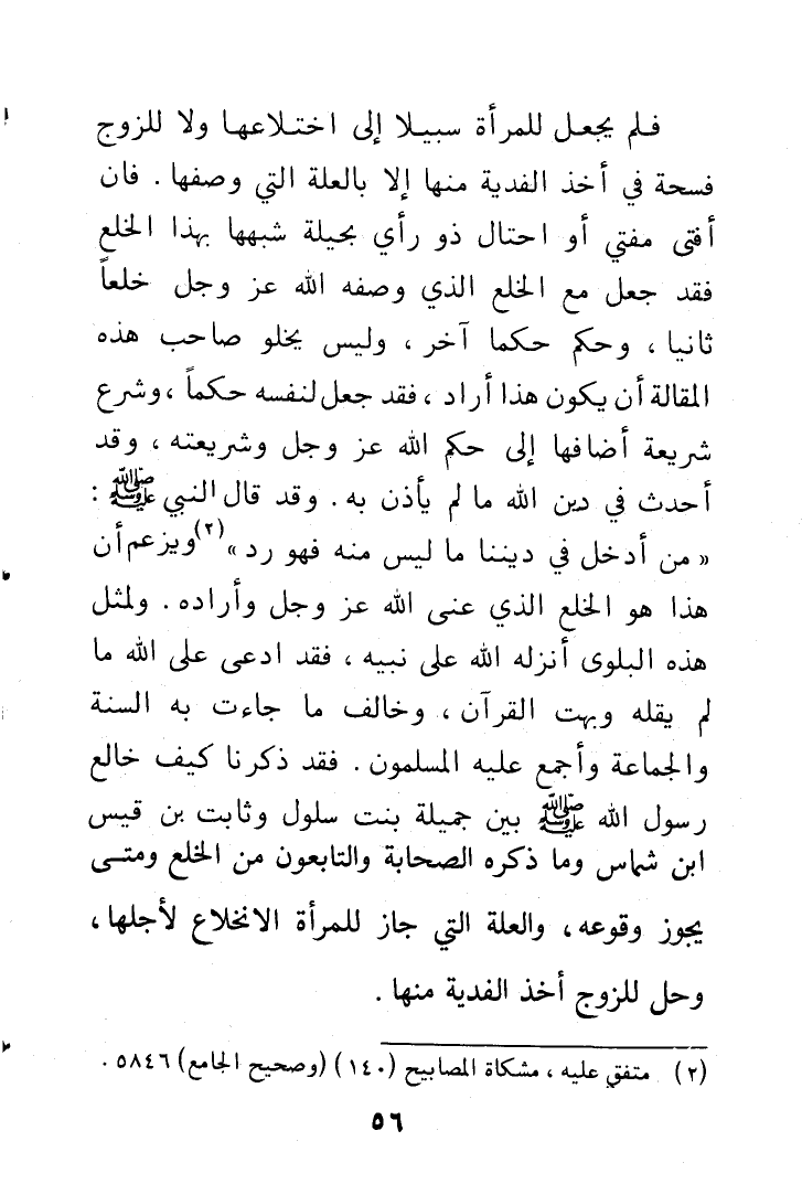 : 229] . فَلَمْ يَجْعَلْ لِلْمَرْأَةِ سَبِيلًا إِلَى اخْتِلَاعِهَا , وَلَا لِلزَّوْجِ فُسْحَةً فِي أَخْذِ الْفِدْيَةِ مِنْهَا إِلَّا بِالْعِلَّةِ الَّتِي وَصَفَهَا. فَإِنْ أَفْتَى مُفْتٍ , أَوِ احْتَالَ ذُو رَأْيٍ بِحِيلَةٍ , شَبَّهَهَا بِهَذَا الْخُلْعِ , فَقَدْ جَعَلَ مَعَ الْخُلْعِ الَّذِي وَصَفَهُ اللَّهُ عَزَّ وَجَلَّ خُلْعًا ثَانِيًا , وَحَكَمَ حُكْمًا آخَرَ , وَلَيْسَ يَخْلُو صَاحِبُ هَذِهِ الْمَقَالَةِ أَنْ يَكُونَ هَذَا أَرَادَ , فَقَدْ جَعَلَ لِنَفْسِهِ حُكْمًا , وَشَرَعَ شَرِيعَةً أَضَافَهَا إِلَى حُكْمِ اللَّهِ عَزَّ وَجَلَّ وَشَرِيعَتِهِ , وَقَدْ أَحْدَثَ فِي دِينِ اللَّهِ مَا لَمْ يَأْذَنْ بِهِ. وَقَدْ قَالَ النَّبِيُّ صَلَّى اللهُ عَلَيْهِ وَسَلَّمَ: «مَنْ أَدْخَلَ فِي دِينِنَا مَا لَيْسَ مِنْهُ فَهُوَ رَدٌّ» . وَيَزْعُمُ أَنَّ هَذَا هُوَ الْخُلْعُ الَّذِي عَنَى اللَّهُ عَزَّ وَجَلَّ وَأَرَادَهُ. وَلِمِثْلِ هَذِهِ الْبَلْوَى أَنْزَلَهُ اللَّهُ عَلَى نَبِيِّهِ , فَقَدِ ادَّعَى عَلَى اللَّهِ مَا لَمْ يَقُلْهُ , وَبَهَتَ الْقُرْآنَ , وَخَالَفَ مَا جَاءَتْ بِهِ السُّنَّةُ وَالْجَمَاعَةُ , وَأَجْمَعَ عَلَيْهِ الْمُسْلِمُونَ. فَقَدْ ذَكَرْنَا كَيْفَ خَالَعَ رَسُولُ اللَّهِ صَلَّى اللهُ عَلَيْهِ وَسَلَّمَ بَيْنَ جَمِيلَةَ بِنْتِ سَلُولٍ , وَثَابِتِ بْنِ قَيْسِ بْنِ شَمَّاسٍ , وَمَا ذَكَرَهُ الصَّحَابَةُ وَالتَّابِعُونَ مِنَ الْخُلْعِ , وَمَتَى يَجُوزُ وَقُوعُهُ , وَالْعِلَّةُ الَّتِي جَازَ لِلْمَرْأَةِ الِانْخِلَاعُ لِأَجْلِهَا , وَحَلَّ لِلزَّوْجِ الْفِدْيَةُ مِنْهَا