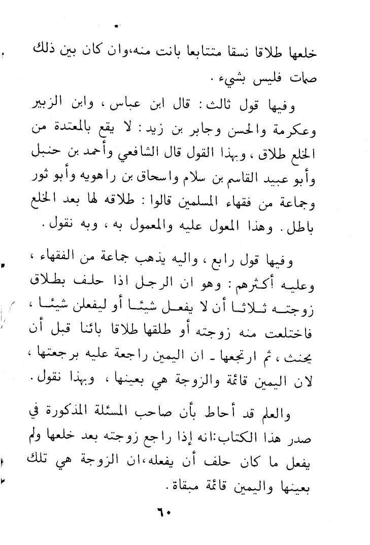 خُلْعِهَا طَلَاقًا نَسَقًا مُتَتَابِعًا بَانَتْ مِنْهُ , وَإِنْ كَانَ بَيْنَ ذَلِكَ صُمَاتٌ فَلَيْسَ بِشَيْءٍ. وَفِيهَا قَوْلٌ ثَالِثٌ: قَالَ ابْنُ عَبَّاسٍ , وَابْنُ الزُّبَيْرِ , وَعِكْرِمَةُ , وَالْحَسَنُ , وَجَابِرُ بْنُ زَيْدٍ , لَا يَقَعُ بِالْمُعْتُدَّةِ مِنَ الْخُلْعِ طَلَاقٌ. وَبِهَذَا الْقَوْلِ قَالَ الشَّافِعِيُّ , وَأَحْمَدُ بْنُ حَنْبَلٍ , وَأَبُو عُبَيْدٍ الْقَاسِمُ بْنُ سَلَّامٍ , وَإِسْحَاقُ بْنُ رَاهَوَيْهِ , وَأَبُو ثَوْرٍ , وَجَمَاعَةٌ مِنْ فُقَهَاءِ الْمُسْلِمِينَ , قَالُوا: طَلَاقُهُ لَهَا بَعْدَ الْخُلْعِ بَاطِلٌ. وَهَذَا الْمُعَوَّلُ عَلَيْهِ , وَالْمَعْمُولُ بِهِ. وَبِهِ نَقُولُ. وَفِيهَا قَوْلٌ رَابِعٌ وَإِلَيْهِ يَذْهَبُ جَمَاعَةٌ مِنَ الْفُقَهَاءِ , وَعَلَيْهِ أَكْثَرُهُمْ: وَهُوَ أَنَّ الرَّجُلَ إِذَا حَلَفَ بِطَلَاقِ زَوْجَتِهِ ثَلَاثًا , أَنْ لَا يَفْعَلَ شَيْئًا , أَوْ لَيَفْعَلَنَّ شَيْئًا , فَاخْتَلَعَتْ مِنْهُ زَوْجَتُهُ , أَوْ طَلَّقَهَا طَلَاقًا بَائِنًا قَبْلَ أَنْ يَحْنَثَ , ثُمَّ ارْتَجَعَ , أَنَّ الْيَمِينَ رَاجِعَةٌ عَلَيْهِ بِرَجْعَتِهَا , لِأَنَّ الْيَمِينَ قَائِمَةٌ , وَالزَّوْجَةُ هِيَ بِعَيْنِهَا. وَبِهَذَا نَقُولُ. وَالْعِلْمُ قَدْ أَحَاطَ بِأَنَّ صَاحِبَ الْمَسْأَلَةِ الْمَذْكُورَةِ فِي صَدْرِ هَذَا الْكِتَابِ أَنَّهُ إِذَا رَاجَعَ زَوْجَتَهُ بَعْدَ خُلْعِهَا وَلَمْ يَفْعَلْ مَا كَانَ حَلَفَ أَنْ يَفْعَلَهُ , أَنَّ الزَّوْجَةَ هِيَ تِلْكَ بِعَيْنِهَا , وَالْيَمِينُ قَائِمَةٌ مُبْقَاةٌ.