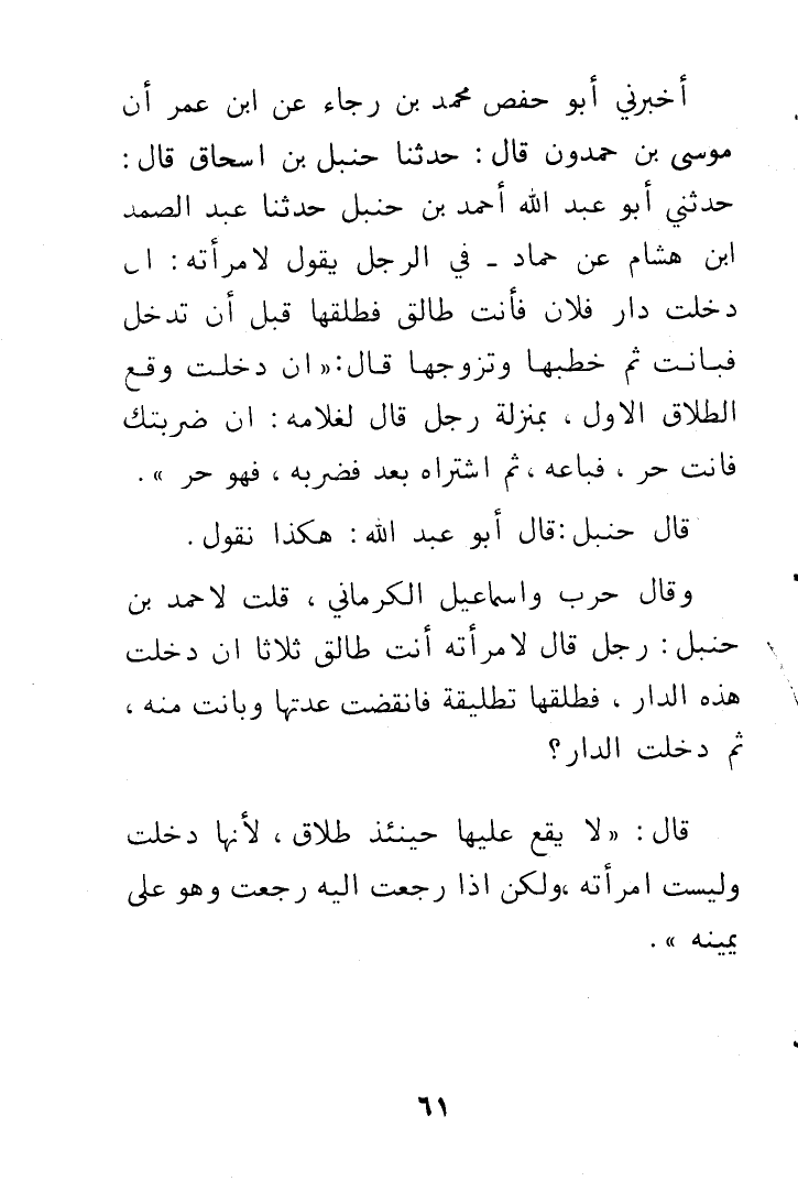 أَخْبَرَنِي أَبُو حَفْصٍ عُمَرُ بْنُ مُحَمَّدِ بْنِ رَجَاءٍ , عَنْ أَبِي عِمْرَانَ مُوسَى بْنِ حَمْدُونَ قَالَ: حَدَّثَنَا حَنْبَلُ بْنُ إِسْحَاقَ , قَالَ: حَدَّثَنِي أَبُو عَبْدِ اللَّهِ أَحْمَدُ بْنُ حَنْبَلٍ , حَدَّثَنَا عَبْدُ الصَّمَدِ , عَنْ هِشَامٍ , عَنْ حَمَّادٍ , §فِي الرَّجُلِ يَقُولُ لِامْرَأَتِهِ: إِنْ دَخَلْتِ دَارَ فُلَانٍ فَأَنْتِ طَالِقٌ , فَطَلَّقَهَا قَبْلَ أَنْ تَدْخُلَ فَبَانَتْ , ثُمَّ خَطَبَهَا وَتَزَوَّجَهَا قَالَ: إِنْ دَخَلَتْ وَقَعَ الطَّلَاقُ الْأَوَّلُ. بِمَنْزِلَةِ رَجُلٍ قَالَ لِغُلَامِهِ: إِنْ ضَرَبْتُكَ فَأَنْتَ حُرٌّ. فَبَاعَهُ. ثُمَّ اشْتَرَاهُ بَعْدُ فَضَرَبَهُ , فَهُوَ حُرٌّ. قَالَ حَنْبَلٌ قَالَ أَبُو عَبْدِ اللَّهِ: هَكَذَا نَقُولُ. وَقَالَ حَرْبُ بْنُ إِسْمَاعِيلَ الْكَرْمَانِيُّ: قُلْتُ لِأَحْمَدَ بْنِ حَنْبَلٍ: رَجُلٌ قَالَ لِامْرَأَتِهِ: أَنْتِ طَالِقٌ ثَلَاثًا إِنْ دَخَلْتِ هَذِهِ الدَّارَ. فَطَلَّقَهَا تَطْلِيقَةً فَانْقَضَتْ عِدَّتُهَا وَبَانَتْ مِنْهُ , ثُمَّ دَخَلَتِ الدَّارَ؟ . قَالَ: لَا يَقَعُ عَلَيْهَا حِينَئِذٍ طَلَاقٌ؛ لِأَنَّهَا دَخَلَتْ وَلَيْسَتِ امْرَأَتَهُ , وَلَكِنْ إِذَا رَجَعَتْ إِلَيْهِ رَجَعَتْ وَهُوَ عَلَى يَمِينِهِ
