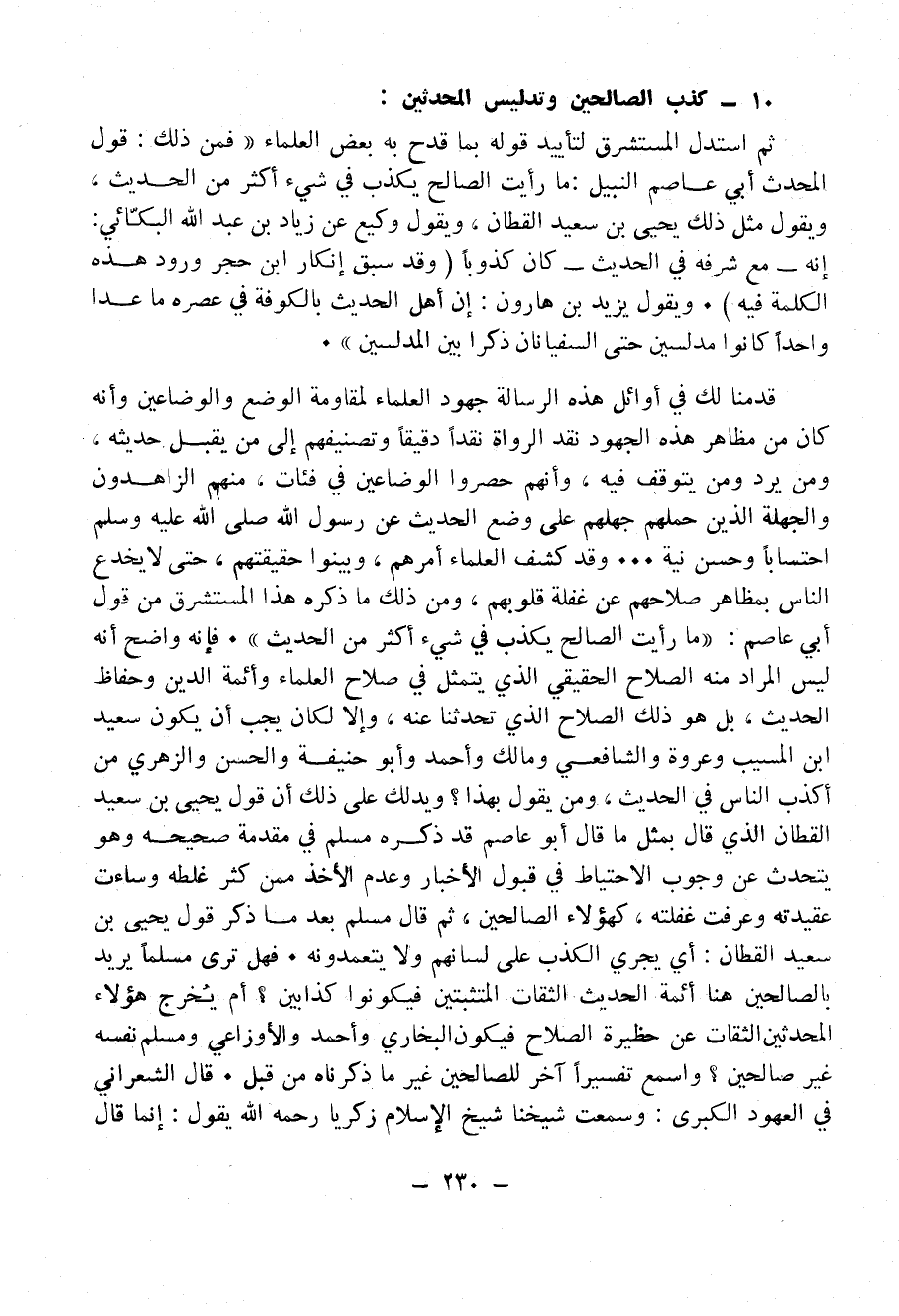 قدَّمنا لك في أوائل هذه الرسالة جهود العلماء لمقاومة الوضع والوَضَّاعِينَ وأنه كان من مظاهر هذه الجهود نقد الرُواة نقداً دقيقاً وتصنيفهم إلى من يقبل حديثه، ومن يُرَدُّ ومن يتوقف فيه، وأنهم حصروا الوَضَّاعِينَ في فئات، منهم الزاهدون والجَهَلة الذين حملهم جهلُهُم على وضع الحديث عن رسول الله - صَلََّى اللهُ عَلَيْهِ وَسَلَّمَ - احتساباً وحُسْن نية ... وقد كشف العلماء أمرهم، وبيَّنوا حقيقتهم، حتى لا يخدع الناس بمظاهر صلاحهم عن غفلة قلوبهم، ومن ذلك ما ذكره هذا المستشرق من قول أبي عاصم: «مَا رَأَيْتُ الصَّالِحَ يَكْذِبُ فِي شَيْءٍ أَكْثَرَ مِنَ الْحَدِيثِ». فإنه واضح أنه ليس المراد منه الصلاح الحقيقي الذي يتمثل في صلاح العلماء وأئمة الدين وحُفاظ الحديث، بل هو ذلك الصلاح الذي تحدثنا عنه، وإلا لكان يجب أن يكون سعيد بن المسيب وعروة والشافعي ومالك وأحمد وأبو حنيفة والحسن والزُّهْرِي من أكذب الناس في الحديث، ومن يقول هذا؟ ويدلك على ذلك قول يحيى بن سعيد القطان الذي قال بمثل ما قال أبو عاصم قد ذكره مسلم في " مقدمة صحيحه " وهو يتحدث عن وجوب الاحتياط في قبول الأخبار وعدم الأخذ مِمَّنْ كثر غلطه وساءت عقيدته وعرفت غفلته، كهؤلاء الصالحين، ثم قال مسلم بعد ما ذكر قول يحيى بن سعيد القطان: أي يجري الكذب على لسانهم ولا يتعمدونه. فهل ترى مسلماً يريد بالصالحين هنا أئمة الحديث الثقات المُتَثَبِّتِينَ فيكونوا كَذَّابِينَ؟ أم يُخرج هؤلاء المُحَدِّثِين الثقات عن حظيرة الصلاح فيكون البخاري وأحمد والأوزاعي ومسلم نفسه غير صالحين؟ واسمع تفسيراً آخر للصالحين غير ما ذكرناه من قبل. قال الشعراني في " العهود الكبرى ": وسمعت شيخنا شيخ الإسلام زكريا - رَحِمَهُ اللهُ - يقول: «إنما قال