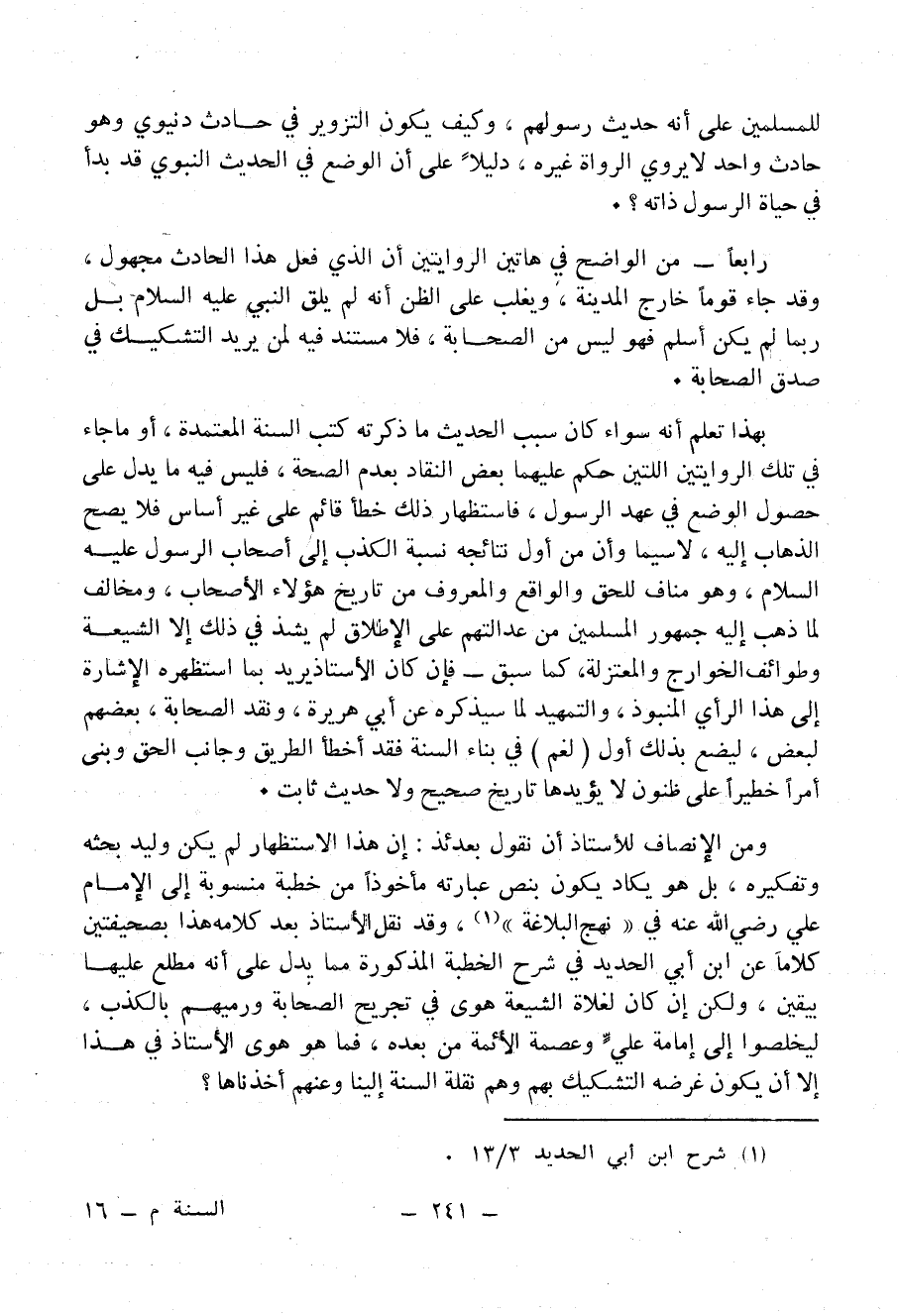 ومن الإنصاف للأستاذ أن نقول بعدئذ: إن هذا الاستظهار لم يكن وليد بحثه وتفكيره، بل هو يكاد يكون بنص عبارته ماخوذاً من خطبة منسوبة إلى الإمام عَلِيٍّ - رَضِيَ اللهُ عَنْهُ - في " نهج البلاغة " (¬1)، وقد نقل الأستاذ بعد كلامه هذا بصحيفتين كلاماً عن ابن أبي الحديد في شرح الخطبة المذكورة مِمَّا يدل على أنه مطلع عليها بيقين، ولكن إن كان لِغُلاَةِ الشِيعَةِ هَوًى في تجريح الصحابة ورميهم بالكذب، ليخلصوا إلى إمامة عَلِيٍّ وعصمة الأئمة من بعده، فما هو هَوَى الأستاذ في هذا إلا أن يكون غرضه التشكيك بهم وَهُمْ نَقَلَةُ السُنَّةِ إلينا وعنهم أخذناها؟