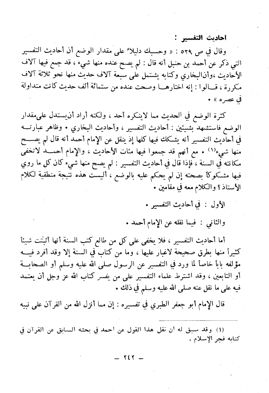 وقال في ص 529: «وحسبك دليلاً على مقدار الوضع أن أحاديث التفسير التي ذكر عن أحمد بن حنبل أنه قال: «لَمْ يَصِحَّ عِنْدَهُ مِنْهَا شَيْءٌ»، قد جمع فيها آلاف الأحاديث، وأن البخاري وكتابه يشتمل على سبعة آلاف حديث منها نحو ثلاثة آلاف مُكَرَّرَةٌ، قالوا: إنه اختارها وَصَحَّتْ عنده من ستمائة ألف حديث كانت متداولة في عصره».