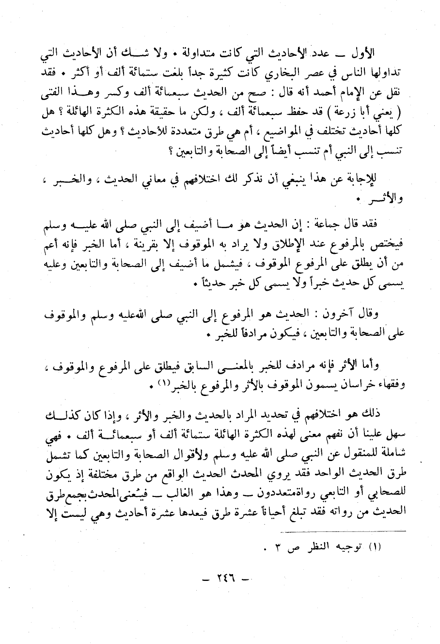 للإجابة عن هذا ينبغي أن نذكر لك اختلافهم في معاني الحديت، والخبر، والأثر.