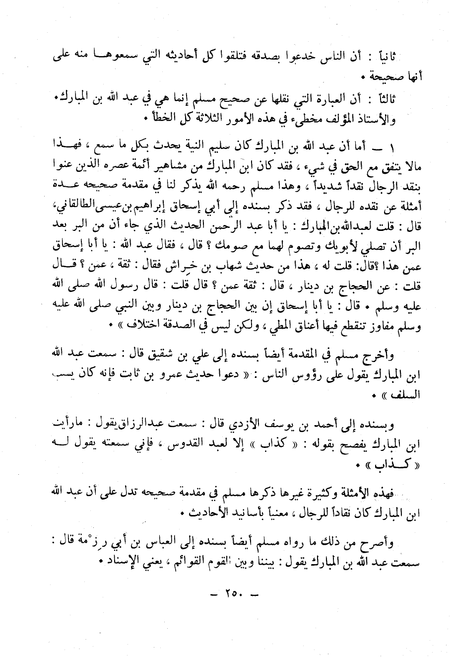 ثالثاً: أن العبارة التي نقلها عن " صحيح مسلم " إنما هي في عبد الله بن المبارك. والأستاذ المولف مخطىء في هذه الأمور الثلاثة كل الخطأ.