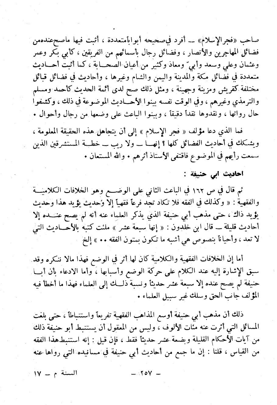 ثم قال في [ص 162] في الباعث الثاني على الوضع وهو الخلافات الكلامية والفقهية: «وكذلك في الفقه فلا تكاد تجد فَرْعًا فقهياً إلا وحديث يؤيد هذا وحديث يؤيد ذاك، حتى مذهب أبي حنيفة الذي يذكر العلماء عنه أنه لم يصح عنده إلا أحاديث قليلة - قال ابن خلدون: «إِنَّهَا سَبْعَةَ عَشَرَ» ملئت كتبه بالأحاديث التي لا تعد، وأحيانا بنصوص هي أشبه ما تكون بمتون الفقه ... » إلخ