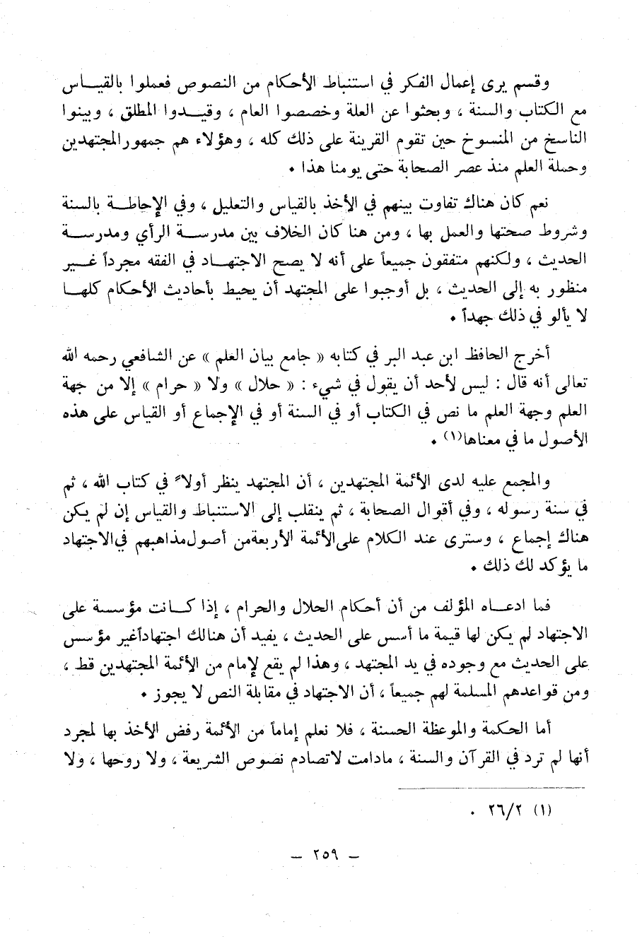فما ادعاه المؤلف من أن أحكام الحلال والحرام، إذا كانت مؤسسة على الاجتهاد لم يكن لها قيمة ما أسس على الحديث، يفيد أن هناك اجْتِهَادًا غير مؤسس على الحديث مع وجوده في يد المجتهد، وهذا لم يقع لإمام من الأئمة المُجْتَهِدِينَ قط، ومن قواعدهم المُسِلَّمَةِ لهم جميعاً أن الاجتهاد في مقابلة النص لا يجوز.