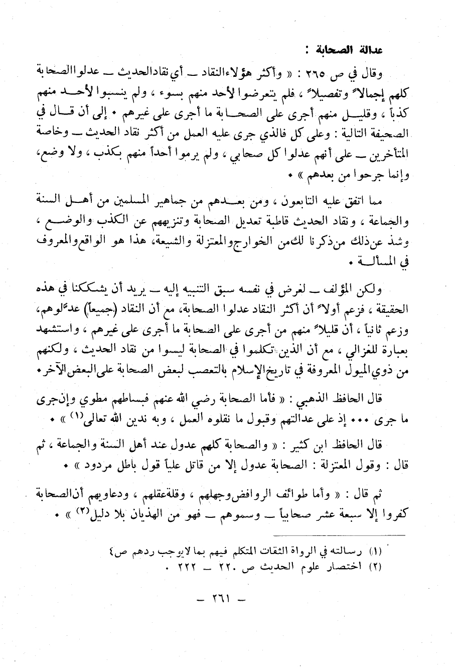 وقال في [ص 265]: «وأكثر هؤلاء النُقَّاد - أي نُقَّادِ الحديث - عَدَّلُوا الصحابة كلهم إجمالاً وتفصيلاً، فلم يتعرضوا لأحد منهم بسوء، ولم ينسبوا لأحد منهم كَذِباً، وقليل منهم أجرى على الصحابة ما أجرى على غيرهم». إلى أن قال: في الصحيفة التالية «وعلى كل فالذي جرى عليه العمل من أكثر نُقَّادِ الحديث - وخاصة المتأخرين - على أنهم عَدَّلُوا كل صحابي، ولم يرموا أحداً منهم بكذب، ولا وضع، وإنما جَرَّحُوا من بعدهم».