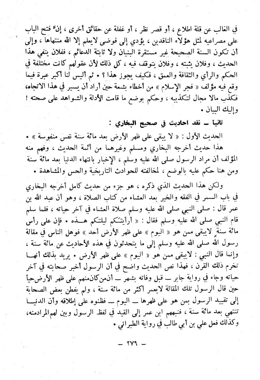 هذا حديث أخرجه البخاري ومسلم وغيرهما من أئمة الحديث، وفهم منه المؤلف أن مراد الرسول - صَلََّى اللهُ عَلَيْهِ وَسَلَّمَ -، الإخبار بانتهاء الدنيا بعد مائة سَنَةٍ ومن هنا حكم عليه بالوضع، لمخالفته للحوادث التاريخية والحس والمشاهدة.