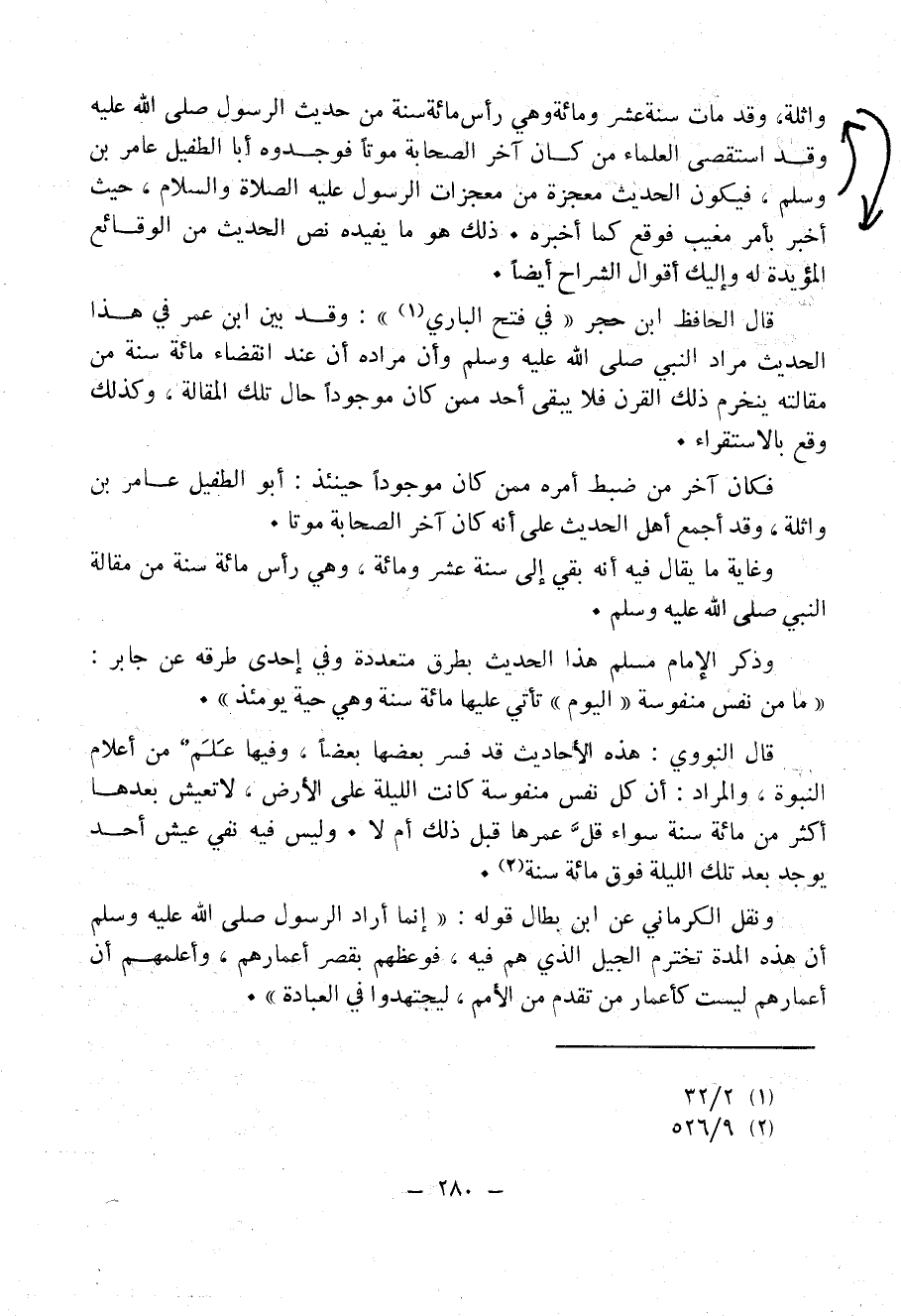 وقد استقصى العلماء من كان آخر الصحابة موتاً فوجدوه أبا الطفيل عامر بن واثلة، وقد مات سَنَةَ عشر ومائة وهي رأس مائة سَنَةٍ من حديث الرسول - صَلََّى اللهُ عَلَيْهِ وَسَلَّمَ - (*) فيكون الحديث معجزة من معجزات الرسول - عَلَيْهِ الصَلاَةُ وَالسَّلاَمُ -، حيث أخبر بأمر مغيب فوقع كما أخبره. ذلك هو ما يفيده نص الحديث من الوقائع المؤيدة له وإليك أقوال الشُرَّاحِ أيضاًً.