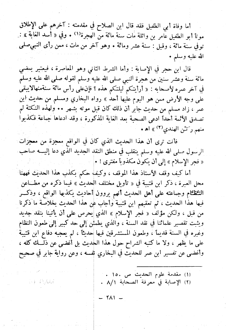 أما كيف وقف الأستاذ هذا الموقف، وكيف حكم بكذب هذا الحديث فَهَهُنَا محل العبرة، ذكر ابن قتيبة في " تأويل مختلف الحديث " فيما ذكره من مطاعن النَظَّامِ وجماعته على أهل الحديث أنهم يَرْوُونَ أحاديث يُكَذِّبُهَا الواقع، وذكر فيها هذا الحديث، ثم تَعَقَّبَهُمْ ابن قتيبة وأجاب عن هذا الحديث بخلاصة ما ذكرنا من قبل، ولكن مؤلف " فجر الإسلام " الذي يحرص على أن يأتينا بنقد جديد ويثبت تقصير علمائنا في نقد السُنَّةِ، والذي يطمئن إلى حد كبير إلى طعون النَظَّامِ وغيره في السُنَّةِ قَدِيمًا، وطعون المُسْتَشْرِقِينَ فيها حَدِيثًا، لم يعجبه دفاع ابن قتيبة على ما يظهر، ولا ما كتبه الشُرَّاحُ حول هذا الحديث بل أغضى عن ذلك كله، وأغضى عن تفسير ابن عمر للحديث في " البخاري " نفسه، وعن رواية جابر في " صحيح