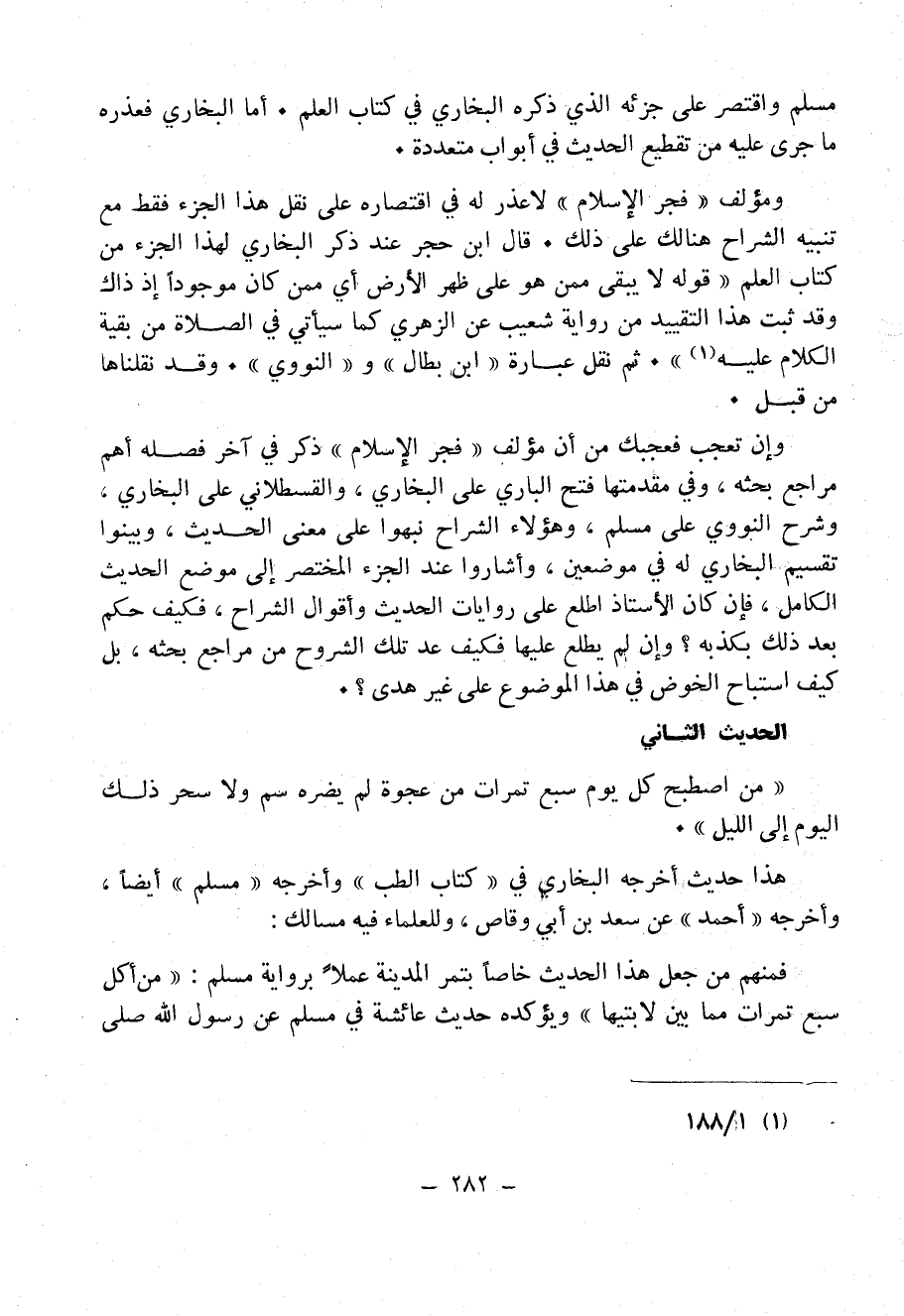 وإن تعجب فعجبك من أن مؤلف " فجر الإسلام " ذكر في آخر فصله أهم مراجع بحثه، وفي مقدمتها " فتح الباري "، و" القسطلاني على البخاري " و" شرح النووي على مسلم "، وهؤلاء الشُرَّاح نَبَّهُوا على معنى الحديث، وَبَيَّنُوا تقسيم البخاري له في موضعين، وأشاروا عند الجزء المختصر إلى موضع الحديث الكامل، فإن كان الأستاذ اطلع على روايات الحديث وأقوال الشُرَّاحِ، فكيف حكم بعد ذلك بكذبه؟ وإن لم يطلع عليها فكيف عَدَّ تلك الشروح من مراجع بحثه، بل كيف استباح الخوض في هذا الموضرع على غير هدى؟.