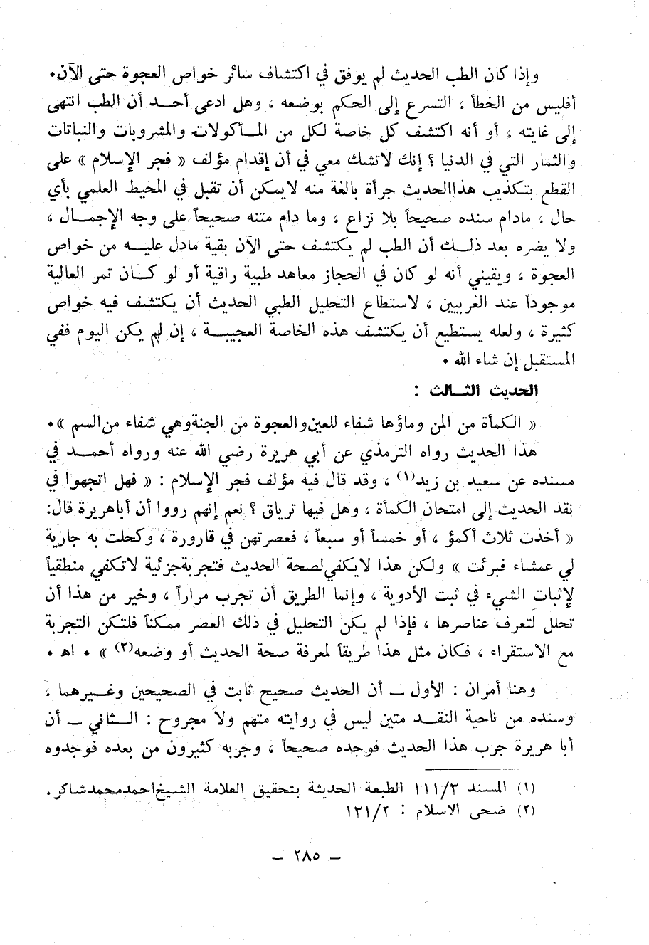 وإذا كان الطب الحديث لم يوفق في اكتشاف سائر خواص العجوة حتى الآن. أفليس من الخطأ، التسرع إلى الحُكْمِ بوضعه، وهل اِدَّعَى أحد أن الطب انتهى إلى غايته، أو أنه اكتشف كل خاصة لكل من المأكولات والمشروبات والنباتات والثمار التي في الدنيا؟ إنك لا تشك معي في أن إقدام مؤلف " فجر الإسلام " على القطع بتكذيب هذا الحديث جُرْأَةٌ بالغة منه لا يمكن أن تقبل في المحيط العلمي بأي حال: ما دام سنده صحيحاً بلا نزاع، وما دام متنه صحيحاً على وجه الإجمال، ولا يضره بعد ذلك أن الطب لم يكتشف حتى الآن بقية ما دل عليه من خواص العجوة، ويقيني أنه لو كان في الحجاز معاهد طبية راقية أو لو كان تمر العالية موجوداً عند الغَرْبِيِّينَ، لاستطاع التحليل الطبي الحديث أن يكتشف فيه خواص كثيرة: ولعله يستطيع أن يكتشف هذه الخاصة العجيبة، إن لم يكن اليوم ففي المستقبل إن شاء الله.