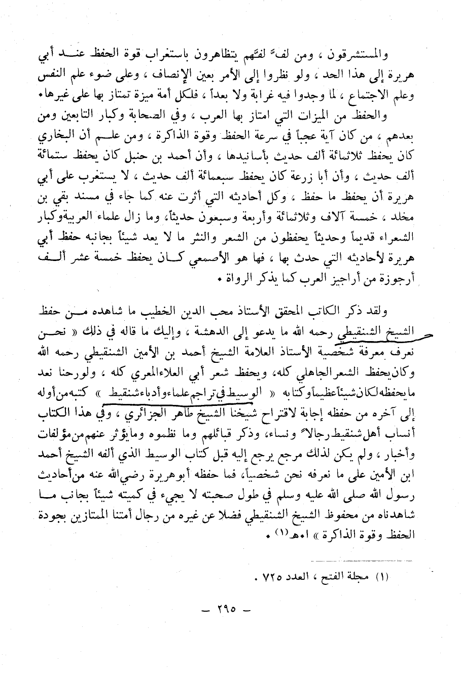 ولقد ذكر الكاتب المُحَقِّقُ الأستاذ محب الدين الخطيب ما شاهده من حفظ الشيخ الشنقيطي - رَحِمَهُ اللهُ - ما يدعو إلى الدهشة، وإليك ما قاله في ذلك: «نحن نعرف معرفة شخصية الأستاذ العَلاَّمَة الشيخ أحمد بن الأمين الشنقيطي - رَحِمَهُ اللهُ - وكان يحفظ الشعر الجاهلي كله، ويحفظ شعر أبي العلاء المعري كله، ولو رحنا نَعُدُّ ما يحفظه لكان شيئاً عظيماً وكتابه " الوسيط في تراجم علماء وأدباء شنقيط " كتبه من أوله إلى آخره من حفظه إجابة لاقتراح شيخنا الشيخ طاهر الجزائري، وفي هذا الكتاب أنساب أهل شنقيط رجالاً ونساءً، وذكر قبائلهم وما نظموه وما يؤثر عنهم من مؤلفات وأخبار، ولم يكن لذلك مرجع يرجع إليه قبل كتاب " الوسيط " الذي ألفه الشيخ أحمد بن الأمين على ما نعرفه نحن شخصياً، فما حفظه أبو هريرة - رَضِيَ اللهُ عَنْهُ - من أحاديث رسول الله - صَلََّى اللهُ عَلَيْهِ وَسَلَّمَ - في طول صحبته لا يجيء في كميته شيئاً بجانب ما شاهدناه من محفوظ الشيخ الشنقيطي فضلاً عن غيره من رجال أُمَّتِنَا الممتازين بجودة الحفظ وقوة الذاكرة». اهـ. (¬1).