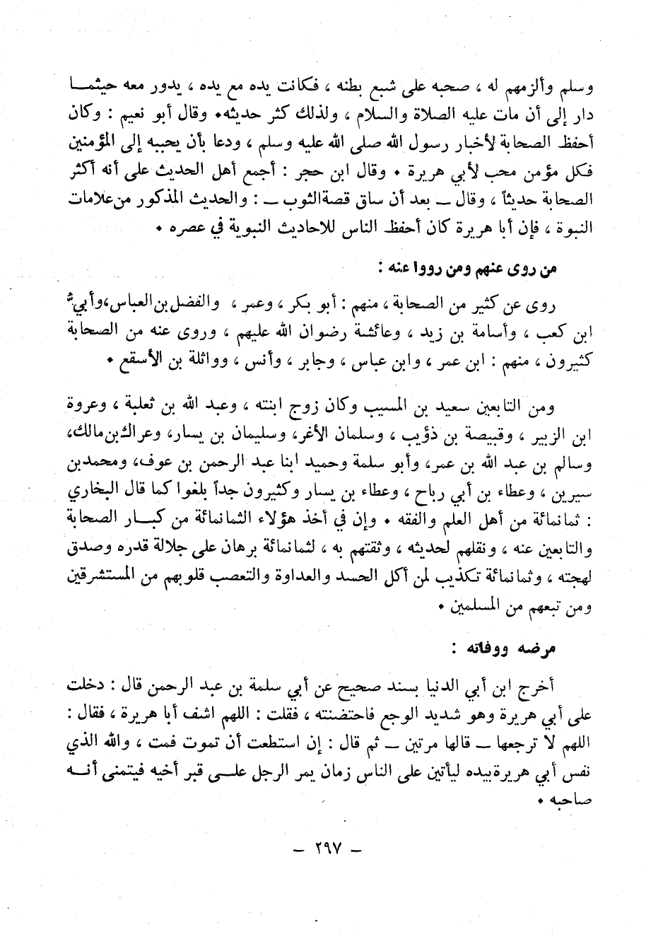 ومن التَّابِعِينَ: سعيد بن المسيب وكان زوج ابنته، وعبد الله بن ثعلبة، وعروة بن الزبير، وقُبيصة بن ذؤيب، وسلمان الأغر، وسليمان بن يسار، وعراك بن مالك، وسالم بن عبد الله بن عمر، وأبو سلمة وَحُمَيْدٌ ابنا عبد الرحمن بن عوف، ومحمد بن سيرين، وعطاء بن أبي رباح، وعطاء بن يسار وكثيرون جِدًّا بلغوا كما قال البخاري: ثمانمائة من أهل العلم والفقه. وإن في أخذ هؤلاء الثمانمائة من كبار الصحابة والتَّابِعِينَ عنه، ونقلهم لحديثه، وثقتهم به، لثمانمائة برهان على جلالة قدره وصدق لهجته، وثمانمائة تكذيب لمن أكل الحسد والعداوة والتعصب قلوبهم من المُسْتَشْرِقِينَ ومن تبعهم من المُسْلِمِينَ.