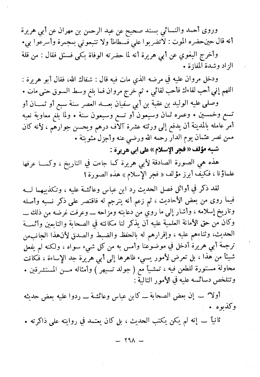لقد ذكر في أوائل فصل الحديث رَدَّ ابن عباس وعائشة عليه، وتكذيبهما له فيما روى من بعض الأحاديث، ثم زعم أنه يترجم له فاقتصر على ذكر نسبه وأصله وتاريخ إسلامه، وأشار إلى ما رُوِيَ من دعابته ومزاحه - وعرفت غرضه من ذلك - وكان من حق الأمانة العلمية عليه أن يذكر لنا مكانته في الصحابة والتَّابِعِينَ وأئمة الحديث، وثناءهم عليه، وإقرارهم له بالحفظ والضبط والصدق لأن هذا الجانب من ترجمة أبي هريرة أدخل في موضوعنا وأمس به من كل شيء سواه، ولكنه لم يفعل شيئاً من هذا، بل تعرض لآمور يسيء ظاهرها إلى أبي هريرة جِدَّ الإساءة، فكانت محاولة مستورة للطعن فيه، تمشياً مع (جولدتسيهر) وأمثاله من المُسْتَشْرِقِينَ.