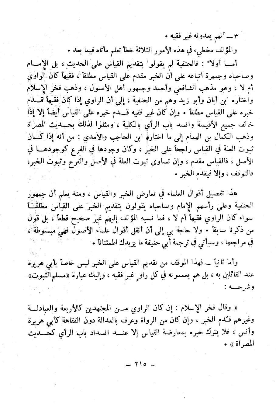 «وَقَالَ فَخْرُ الإِسْلاَمِ: " إِنِ كَانَ الرَّاوِي مِنَ المُجْتَهِدِينَ كَالأَرْبَعَةِ وَالعَبَادِلَةِ وَغَيْرِهِمْ قُدِّمَ الخَبَرُ، وَإِنْ كَانَ مِنَ الرُّوَاةِ وَعُرِفَ بِالعَدَالَةِ دُونَ الفَقَاهَةِ كَأَبِي هُرَيْرَةَ وَأَنَسٍ، فَلاَ يُتْرَكُ خَبَرُهُ بِمُعَارَضَةِ القِيَاسِ إِلاَّ عِنْدَ انْسِدادِ بَابِ الْرَّأْيِ كَحَدِيثِ المُصَرَّاةِ "».