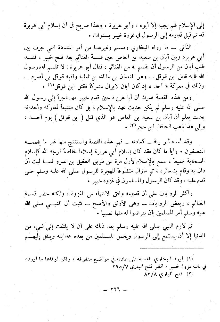 ومن هذه القصة ندرك أن أبا هريرة حين قدم خيبر مهاجراً إلى رسول الله - صَلََّى اللهُ عَلَيْهِ وَسَلَّمَ - لم يكن حديث عهد بالإسلام بل كان متتبعاً لمعاركه وأحداثه بحيث يعلم أن أبان بن سعيد بن العاص هو الذي قتل (ابن قوقل) يوم أُحُدْ. وإلى هذا ذهب الحافظ ابن حجر (¬2).