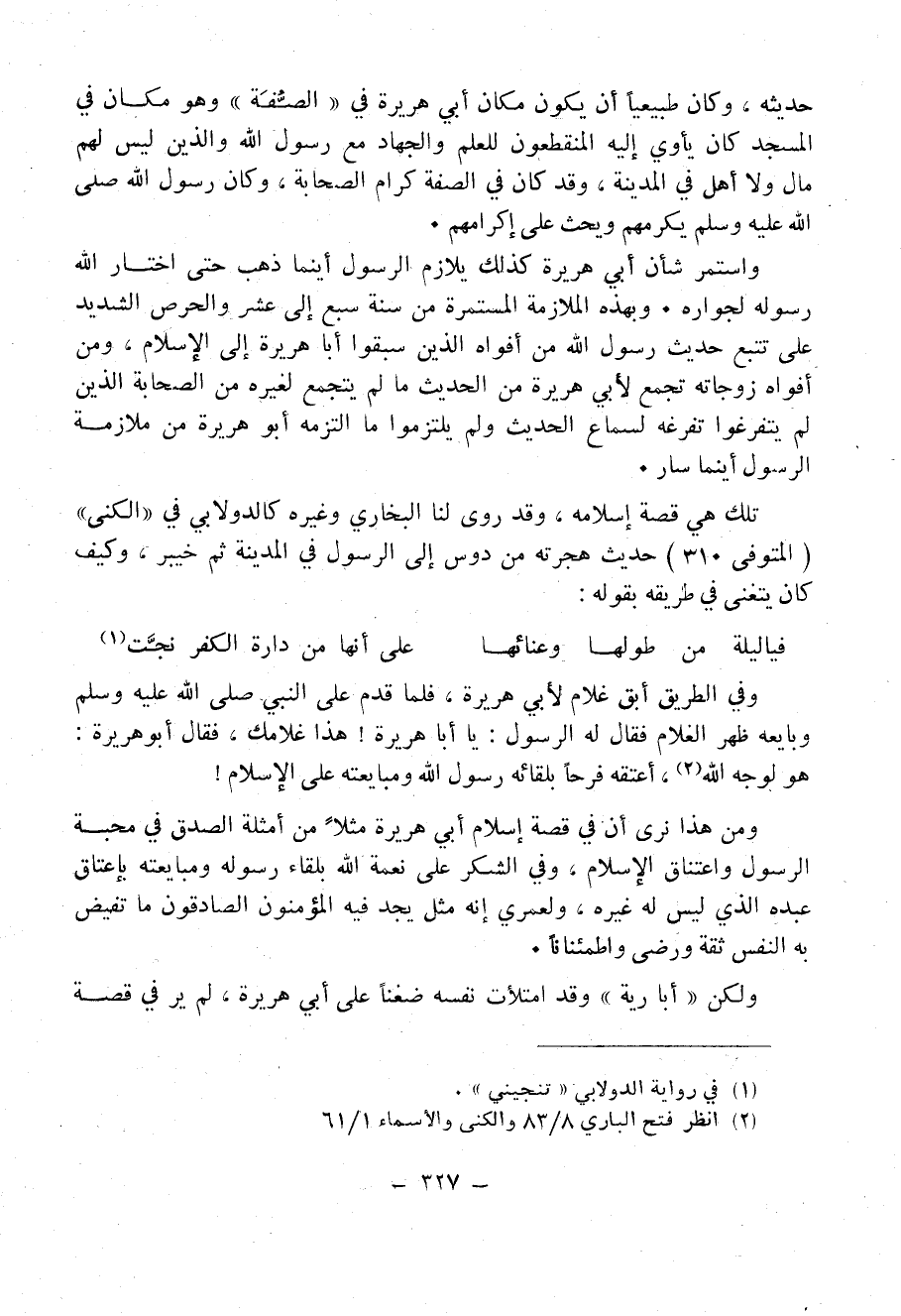 ومن هذا نرى أن في قصة إسلام أبي هريرة مثلاً من أمثلة الصدق في محبة الرسول واعتناق الإسلام، وفي الشكر على نعمة الله بلقاء رسوله ومبايعته بإعتاق عبده الذي ليس له غيره، ولعمري إنه مَثَلٌ يجد فيه المؤمنون الصادقون ما تفيض به النفس ثقةً ورضى واطمئناناً.