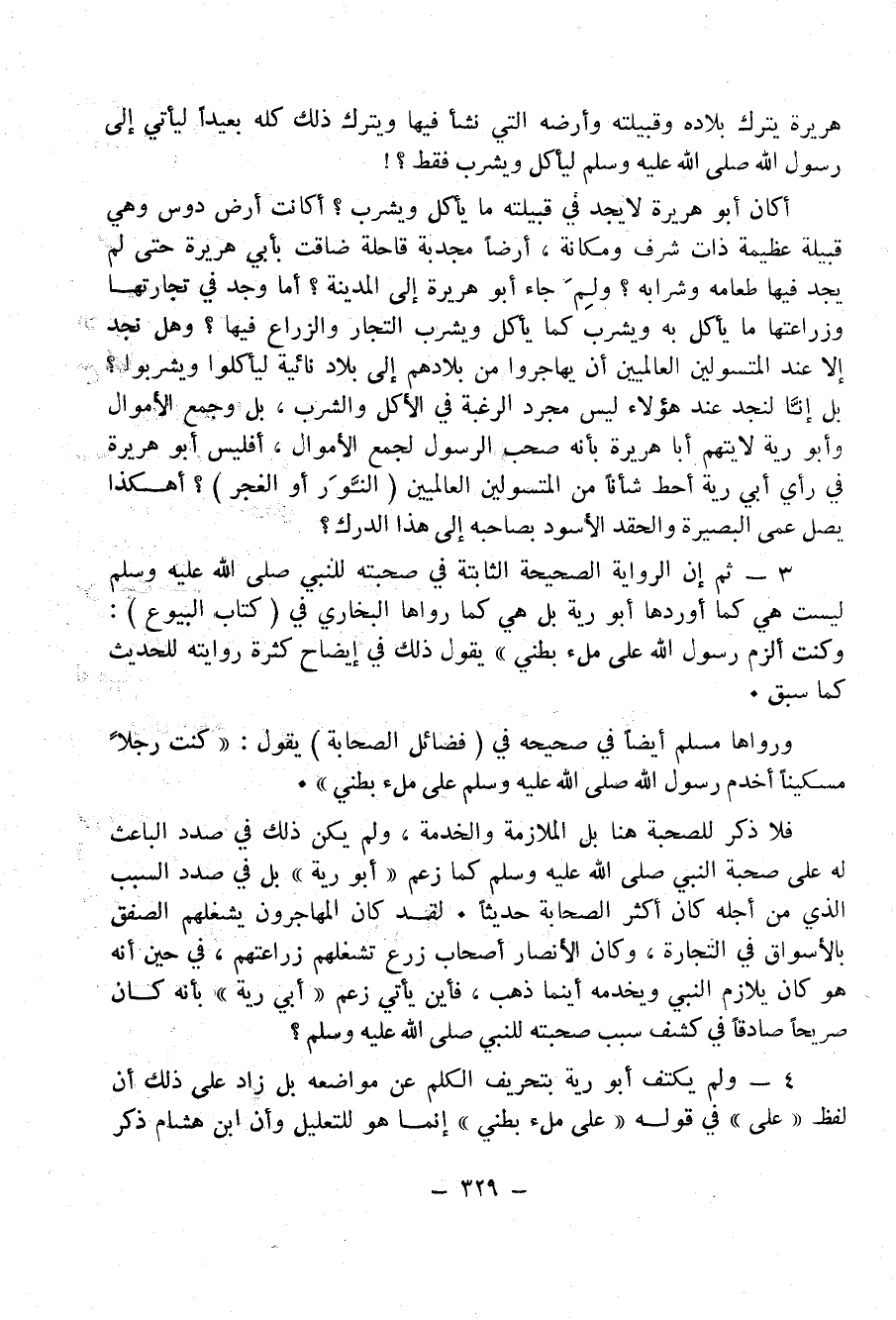 هريرة يترك بلاده وقبيلته وأرضه التي نشأ فيها ويترك ذلك كله بعيداً ليأتي إلى رسول الله - صَلََّى اللهُ عَلَيْهِ وَسَلَّمَ - ليأكل ويشرب فقط؟! أكان أبو هريرة لايجد في قبيلته ما يأكل ويشرب؟ أكانت أرض دَوْسٍ وهي قبيلة عظيمة ذات شرف ومكانة، أرضاً مجدبة قاحلة ضاقت بأبي هريرة حتى لم يجد فيها طعامه وشرابه؟ ولِمَ جاء أبو هريرة إلى المدينة؟ أما وجد في تجارتها وزراعتها ما يأكل به ويشرب كما يأكل ويشرب التجار والزُرَّاع فيها؟ وهل نجد إلا عند المتسولين العالميين أن يهاجروا من بلادهم إلى بلاد نائية ليأكلوا ويشربوا؟ بل إنَّا لنجد عند هؤلاء ليس مجرد الرغبة في الأكل والشرب، بل وجمع الأموال وأَبُو رَيَّةَ لا يتهم أبا هريرة بأنه صحب الرسول لجمع الأموال، أفليس أبو هريرة في رأي أَبِي رَيَّةَ أحط شأناً من المتسولين العالميين (النَّوَر أو الغجر)؟ أهكذا يصل عمى البصيرة والحقد الأسود بصاحبه إلى هذا الدرك؟