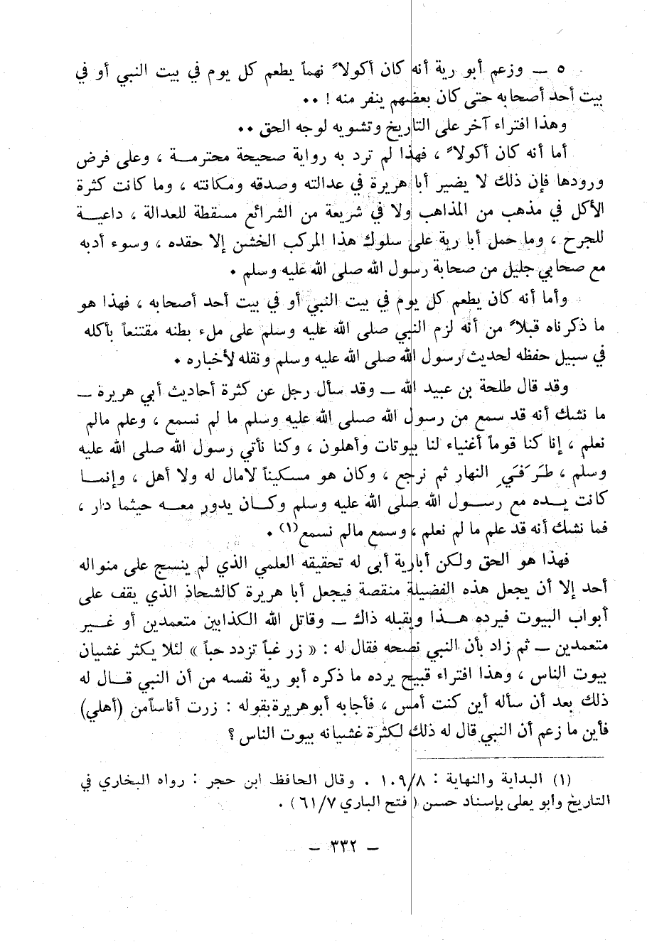 5 - وزعم أَبُو رَيَّةَ أنه كان أكولاً نهماً يطعم كل يوم في بيت النَّبِيِّ أو في بيت أحد أصحابه حتى كان بعضهم ينفر منه! .. وهذا افتراء آخر على التاريخ وتشويه لوجه الحق ..