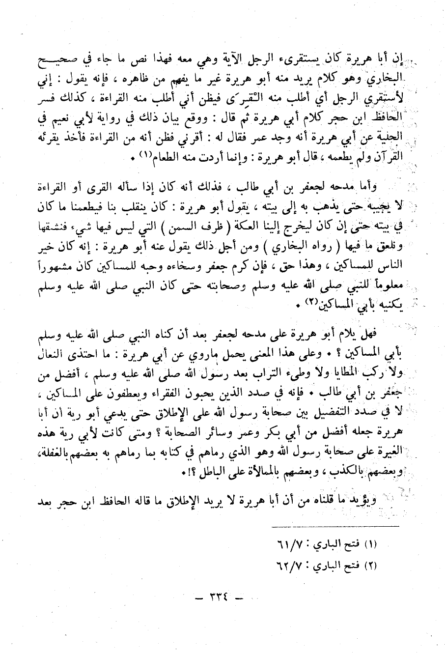 فهل يُلامُ أبو هريرة على مدحه لجعفر بعد أن كَنَّاهُ النَّبِيّ - صَلََّى اللهُ عَلَيْهِ وَسَلَّمَ - بأبي المساكين؟. وعلى هذا المعنى يحمل ما روي عَنْ أَبِي هُرَيْرَةَ: «مَا احْتَذَى النِّعَالَ وَلاَ رَكِبَ المَطَايَا وَلاَ وَطِىءَ التُّرَابَ بَعْدَ رَسُولِ اللَّهِ صَلَّى اللهُ عَلَيْهِ وَسَلَّمَ، أَفْضَلُ مِنَ جَعْفَرِ بْنِ أَبِي طَالِبٍ». فإنه في صدد الذين يحبون الفقراء ويعطفون على المساكين، لا في صدد التفضيل بين صحابة رسول الله على الإطلاق حتى يدعي أَبُو رَيَّةَ أن أبا هريرة جعله أفضل من أبي بكر وعمر وسائر الصحابة؟ ومتى كانت لأَبِي رَيَّةَ هذه الغيرة على صحابة رسول الله وهو الذي رماهم في كتابه بما رماهم به بعضهم بالغفلة، وبعضهم بالكذب، وبعضم بالممالاة على الباطل؟!.