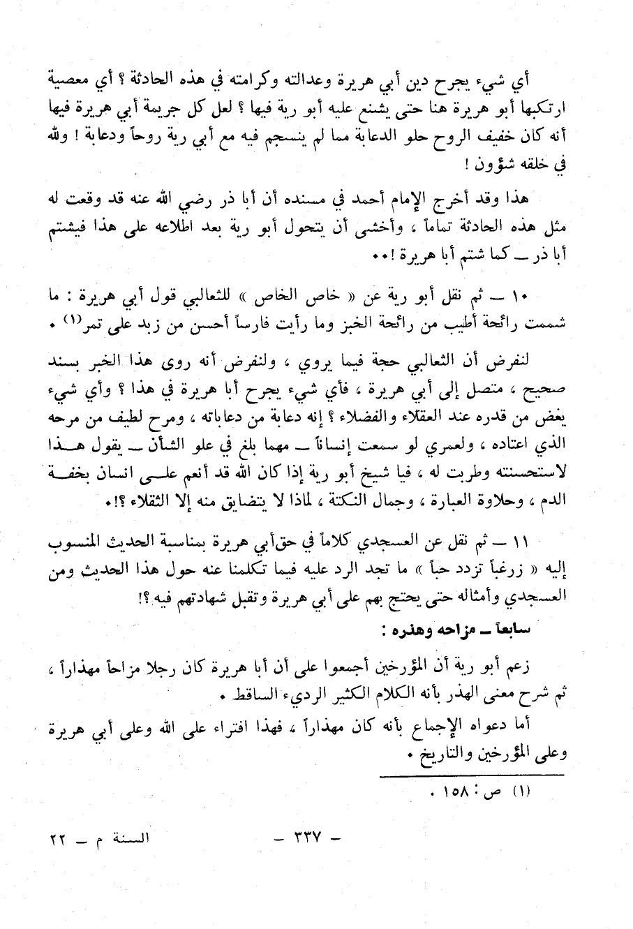 أي شيء يجرح دين أبي هريرة وعدالته وكرامته في هذه الحادثة؟ أي معصية ارتكبها أبو هريرة هنا حتى يشنع عليه أَبُو رَيَّةَ فيها؟ لعل كل جريمة أبي هريرة فيها أنه كان خفيف الروح حلو الدعابة مِمَّا لم ينسجم فيه مع أَبِي رَيَّةَ روحاً ودعابة! ولله في خلقه شؤون!