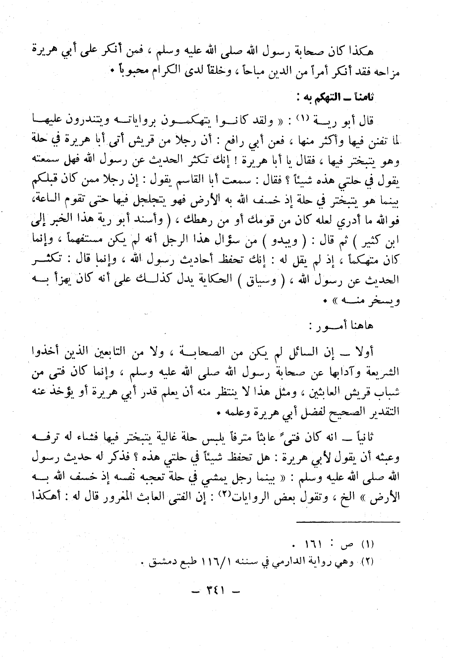 ثانياً - أنه كان فتى عابثاً مترفاً يلبس حلة غالية يتبختر فيها فشاء له ترفه وعبثه أن يقول لأبي هريرة: هل تحفظ شيئاً في حلتي هذه؟ فذكر له حديث رسول الله - صَلََّى اللهُ عَلَيْهِ وَسَلَّمَ -: «بَيْنَمَا رَجُلٌ يَمْشِي فِي حُلَّةٍ تُعْجِبُهُ نَفْسُهُ ... إِذْ خَسَفَ اللَّهُ بِهِ الأَرْضَ» ... الخ، وتقول بعض الروايات (¬2): إن الفتى العابث المغرور قال له: أهكذا