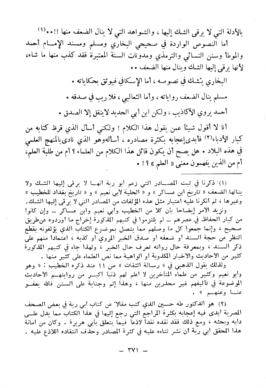 (¬2) هو الدكتور طه حسين الذي كتب مقالاً عن كتاب أَبِي رَيَّةَ في بعض الصحف المصرية أبدى فيه إعجابه بكثرة المراجع التي رجع إليها في هذا الكتاب مِمَّا يدل على دأبه وبحثه: ومع ذلك فقد نقده نقداً لاذعاً فيما يتعلق بأبي هريرة. وكان من أمانة هذا المحقق أَبِي رَيَّةَ أن نشر ثناءه عليه في كثرة المصادر وحذف انتقاده اللاذع عليه.