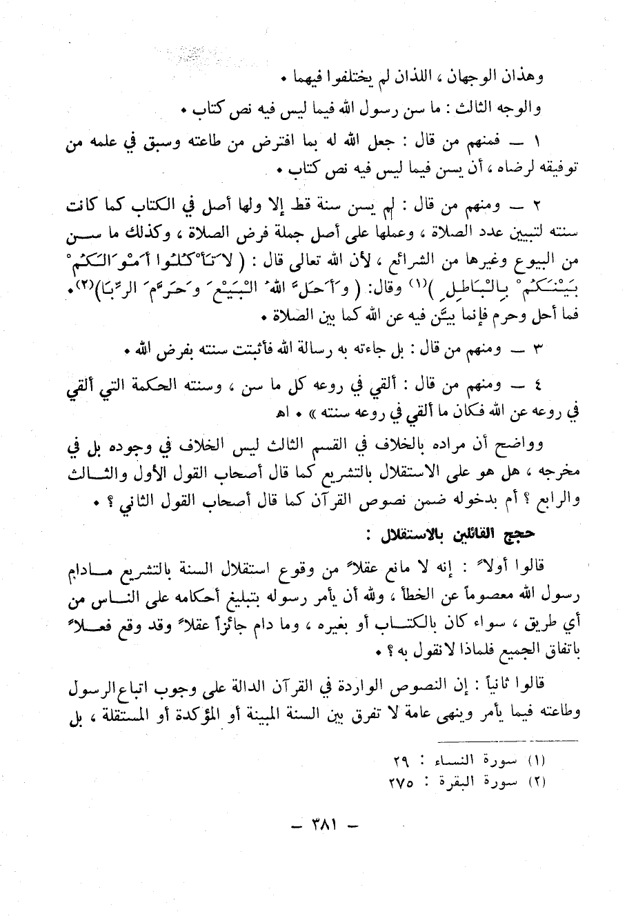 قالوا ثانياً: إنَّ النصوص الواردة في القرآن الدالة على وجوب اتباع الرسول وطاعته فيما يأمر وينهى لا تفرق بين السُنَّةِ المُبَيِّنَةِ أو المؤكدة أو المستقلة، بل