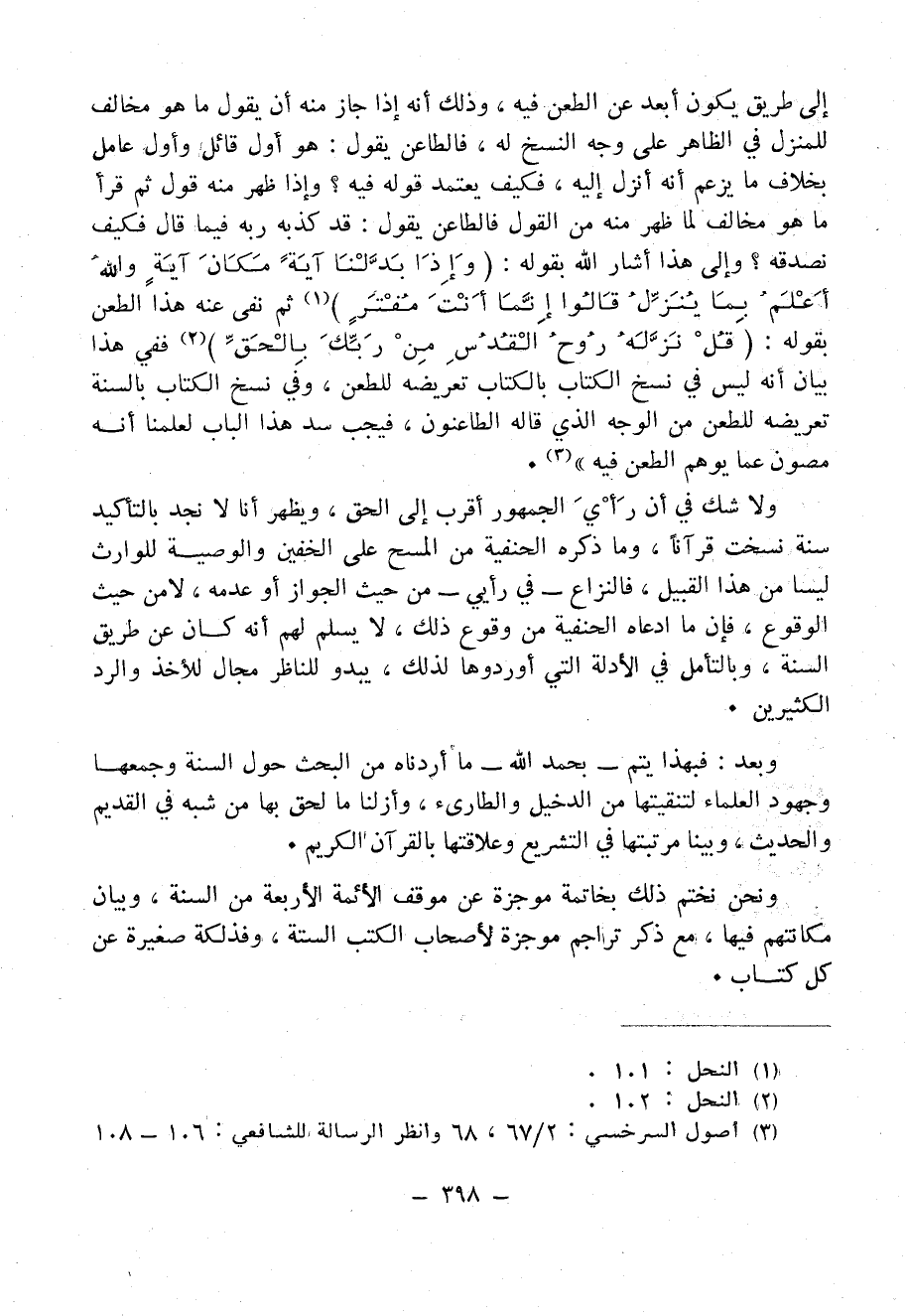 ولا شك في أن رأْيَ الجمهور أقرب إلى الحق، ويظهر أنا لا نجد بالتأكيد سُنّةً نسخت قُرْآناً، وما ذكره الحَنَفِيَّةُ من المسح على الخفين والوصية للوارث ليسا من هذا القبيل، فالنزاع - في رأيي - من حيث الجواز أو عدمه، لا من حيث الوقوع، فإن ما ادعاه الحَنَفِيَّةُ من وقوع ذلك، لا يسلم لهم أنه كان من طريق السُنّةِ، وبالتأمل في الأدلة التي أوردوها لذلك، يبدو الناظر مجال للأخذ والرد الكثيرين.