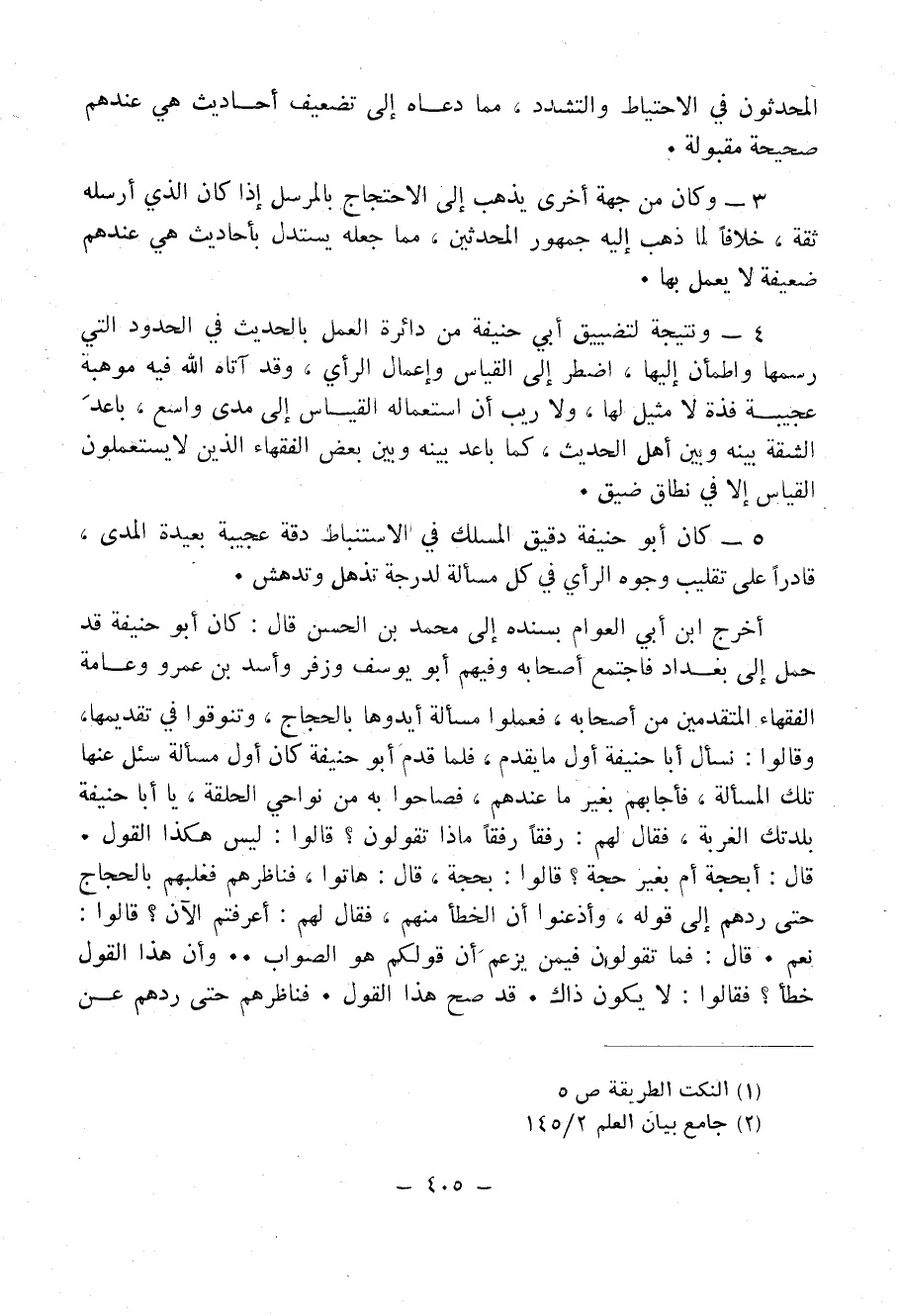 4 - ونتيجة لتضييق أبي حنيفة من دائرة العمل بالحديث في الحدود التي رسمها واطمأن إليها، اضطر إلى القياس وإعمال الرأي، وقد آتاه اللهُ فيه موهبة عجيبة فذة لا مثيل لها، ولا ريب أن استعماله القياس إلى مدى واسع، بَاعَدَ الشُقَّةَ بينه وبين أهل الحديث، كما باعد بينه وبين بعض الفقهاء الذين لايستعملون القياس إلا في نطاق ضيق.