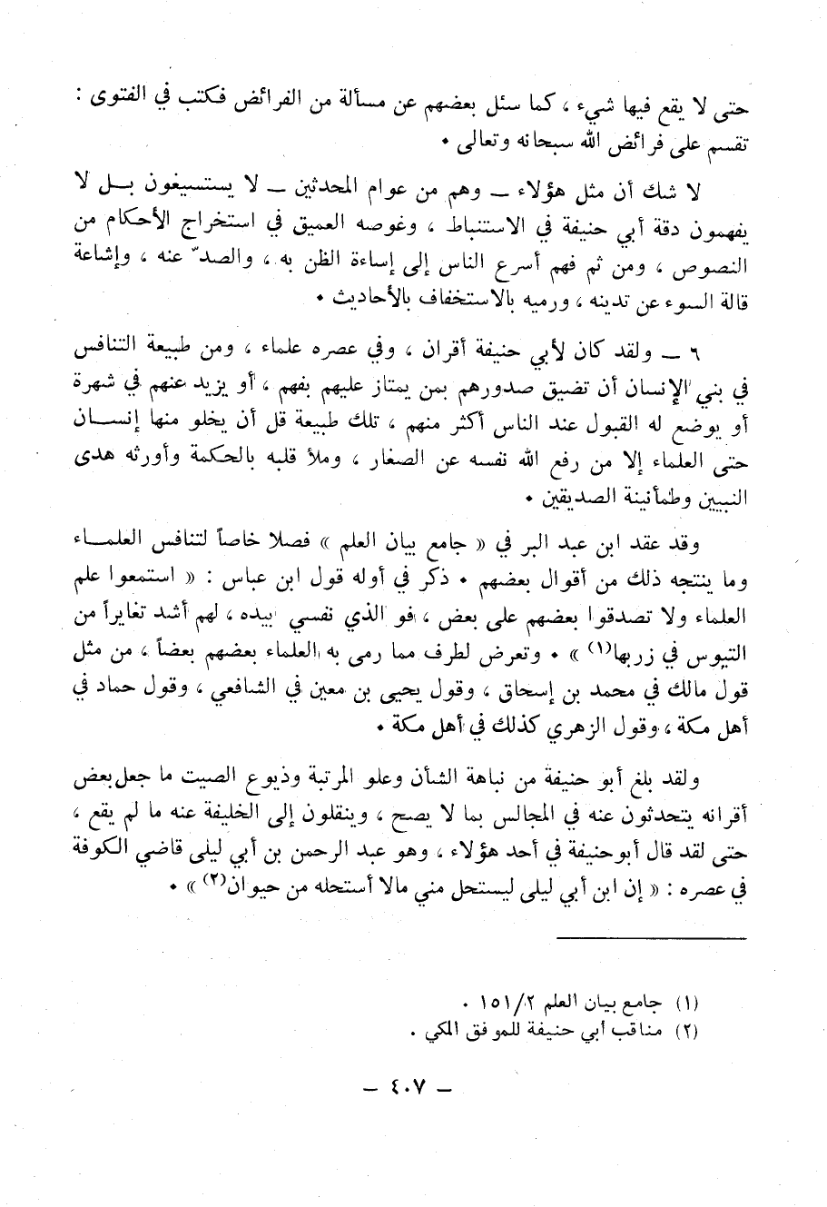 6 - لقد كان لأبي حنيفة أقران، وفي عصره علماء، ومن طبيعة التنافس في بني الإنسان أن تضيق صدورهم بمن يمتاز عليهم بفهم، أو يزيد عنهم في شُهْرَةٍ أو يوضع له القبول عند الناس أكثر منهم، تلك طبيعة قَلَّ أن يخلو منها إنسان حتى العلماء إلا من رفع الله نفسه عن الصَغَارِ. وملأ قلبه بالحكمة وأورثه هُدَى النَبِيِّينَ وطمأنينة الصِدِّيقِينَ.